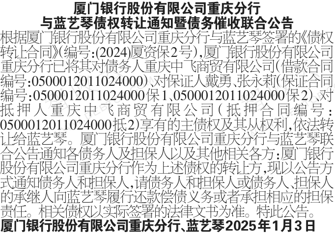 转让公告重庆中飞商贸有限公司厦门银行股份有限公司重庆分行与蓝艺琴债权转让通知暨债务催收联合公告 银行转出重庆中飞商贸有限公司,厦门银行股份有限公司重庆分行与蓝艺琴债权转让通知暨债务催收联合公告,公告日期:2025-01-03,转让方:厦门银行股份有限公司重庆分行,受让方:蓝艺琴,资产总额:0.0万元。重庆中飞商贸有限公司等1户。来源:重庆法治报 公告日期:2025-01-03债权金额债权本金户数1户所涉债务企业重庆中飞商贸有限公司