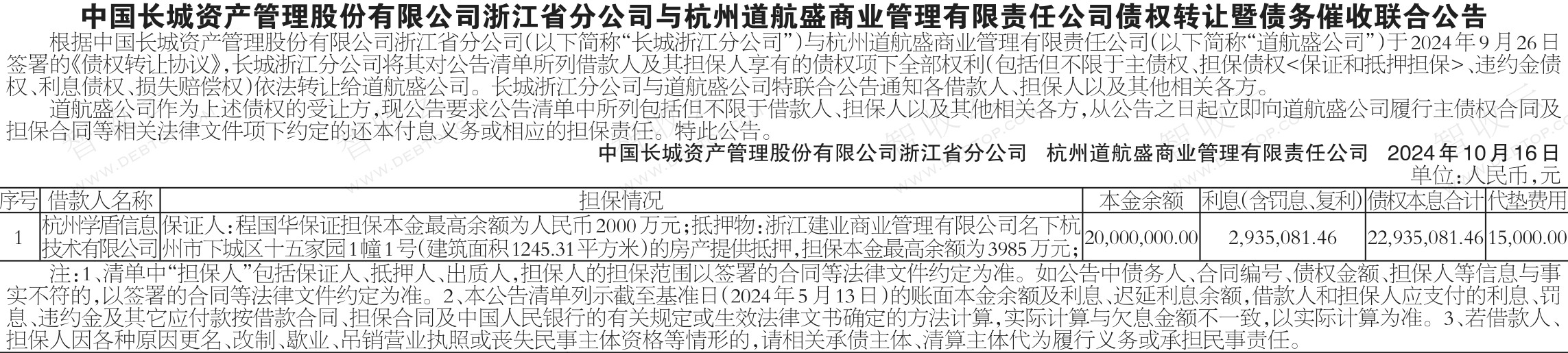 杭州学盾信息技术有限公司中国长城资产管理股份有限公司浙江省分公司与杭州道航盛商业管理有限责任公司债权转让暨债务催收联合公告 AMC转出