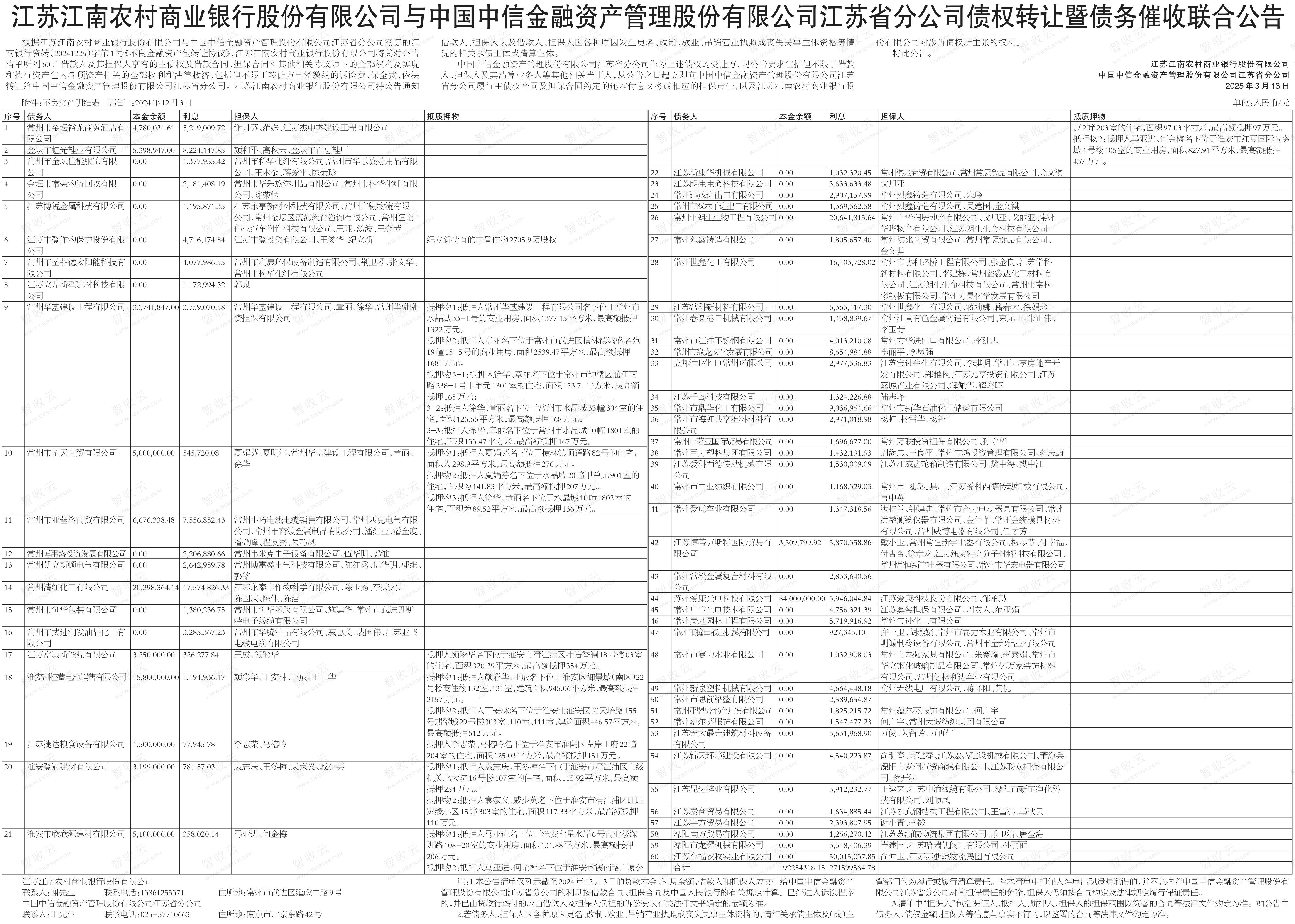 常州市创华包装有限公司,常州市腾田液压机械有限公司,江苏江南农村商业银行股份有限公司与中国中信金融资产管理股份有限公司江苏省分公司债权转让暨债务催收联合公告,公告日期:2025-03-13,转让方:江苏江南农村商业银行股份有限公司,受让方:中国中信金融资产管理股份有限公司江苏省分公司,资产总额:46385.4万元。