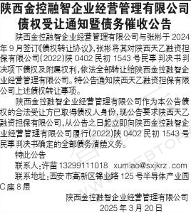 陕西天乙融资担保有限公司,陕西金控融智企业经营管理有限公司债权受让通知暨债务催收公告,公告日期:2025-03-20,转让方:张彬,受让方:陕西金控融智企业经营管理有限公司,资产总额:0.0万元。