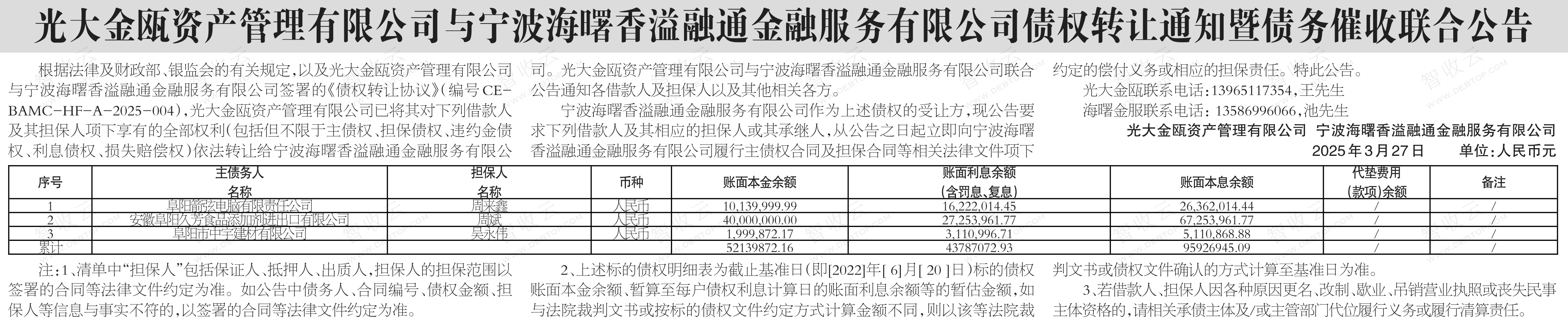 阜阳市中宇建材有限公司,阜阳箭弦电脑有限责任公司光大金瓯资产管理有限公司与宁波海曙香溢融通金融服务有限公司债权转让通知暨债务催收联合公告 AMC转出
