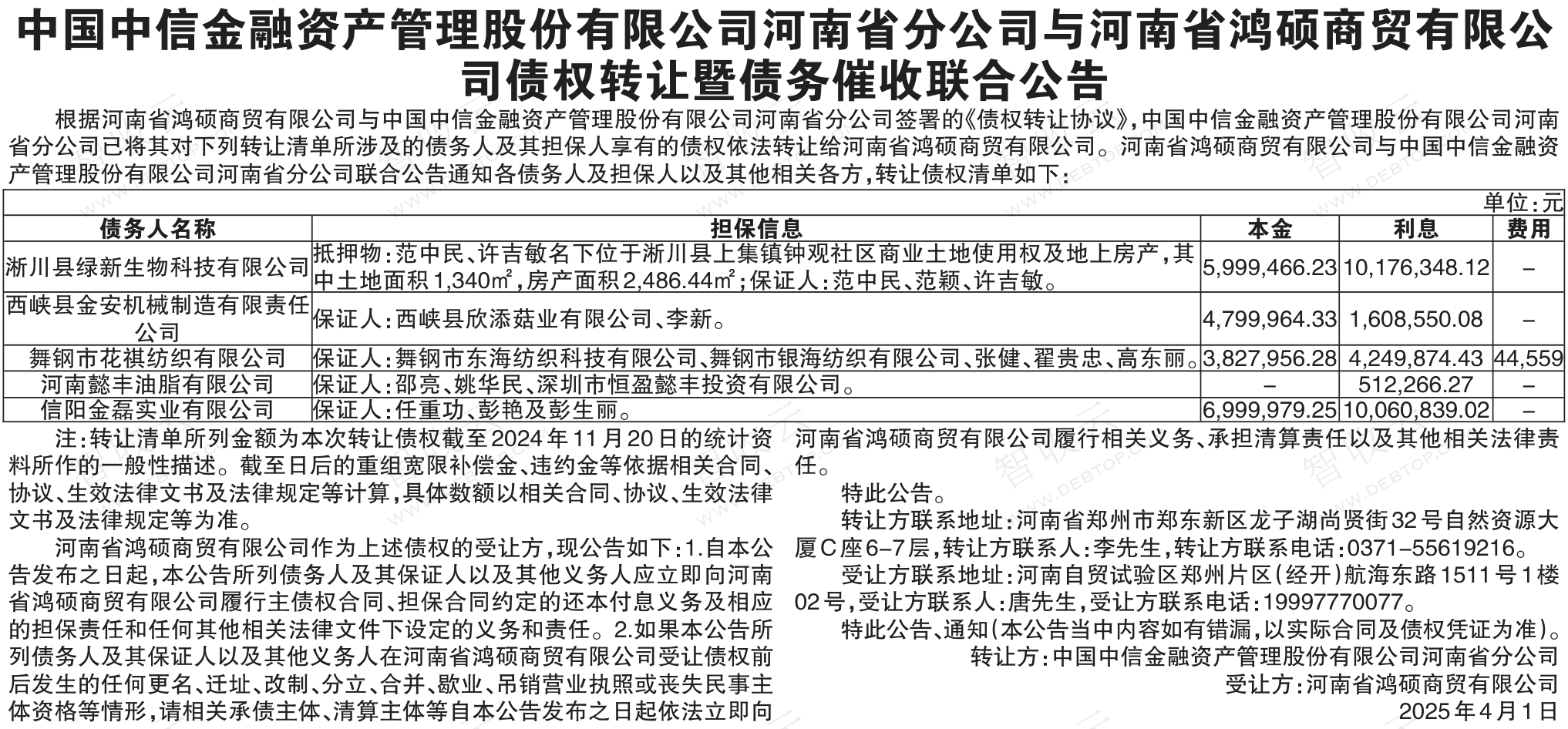 淅川县绿新生物科技有限公司,西峡县金安机械制造有限责任公司中国中信金融资产管理股份有限公司河南省分公司与河南省鸿硕商贸有限公司债权转让暨债务催收联合公告 AMC转出