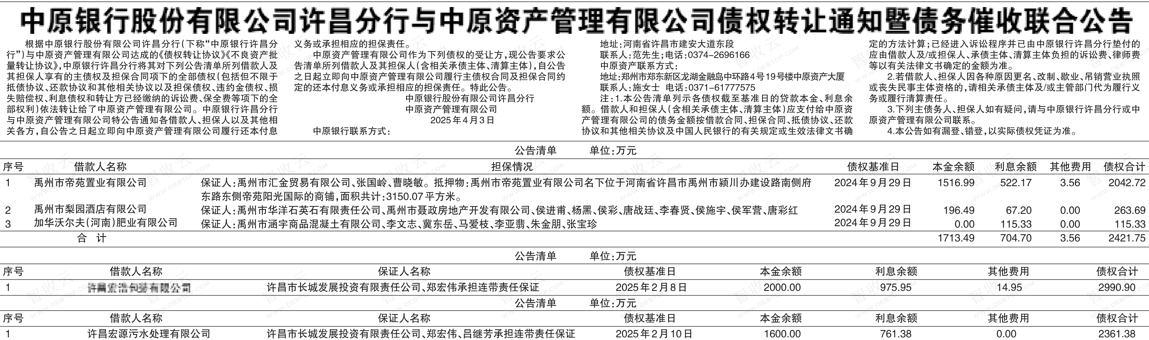 许昌宏源污水处理有限公司,加华沃尔夫(河南)肥业有限公司,中原银行股份有限公司许昌分行与中原资产管理有限公司债权转让通知暨债务催收联合公告,公告日期:2025-04-03,转让方:中原银行股份有限公司许昌分行,受让方:中原资产管理有限公司,资产总额:7444.8万元。