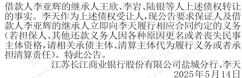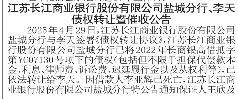 转让公告债权转让暨催收公告 银行转出,债权转让暨催收公告,公告日期:2025-05-14,转让方:江苏长江商业银行股份有限公司盐城分行,受让方:李天,资产总额:0.0万元。李亚辉,陆银,李岩等3户。来源:江南时报 公告日期:2025-05-14债权金额债权本金户数3户