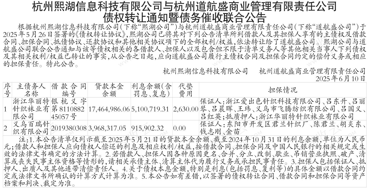 浙江华丽特针织袜业有限公司,义乌百瑞针织有限公司,杭州熙湖信息科技有限公司与杭州道航盛商业管理有限责任公司债权转让通知暨债务催收联合公告,公告日期:2025-06-10,转让方:杭州熙湖信息科技有限公司,受让方:杭州道航盛商业管理有限责任公司,资产总额:2745.3万元。