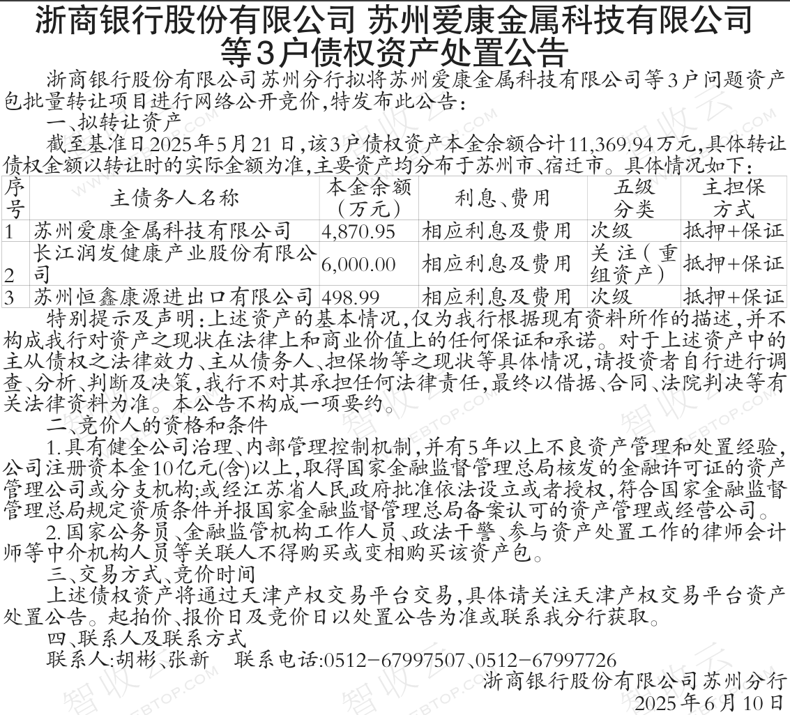 苏州爱康金属科技有限公司,长江润发健康产业股份有限公司,浙商银行股份有限公司苏州爱康金属科技有限公司等3户债权资产处置公告,公告日期:2025-06-10,债权方:浙商银行股份有限公司苏州分行,资产总额:11369.9万元。
