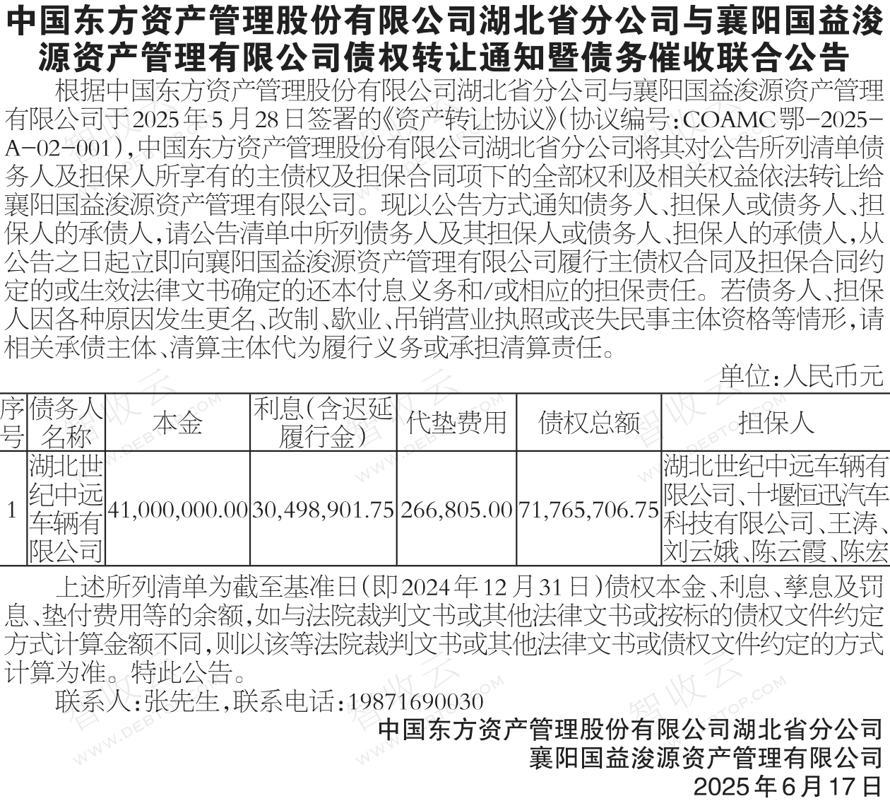 湖北世纪中远车辆有限公司,十堰恒迅汽车科技有限公司,中国东方资产管理股份有限公司湖北省分公司与襄阳国益浚源资产管理有限公司债权转让通知暨债务催收联合公告,公告日期:2025-06-17,转让方:中国东方资产管理股份有限公司湖北省分公司,受让方:襄阳国益浚源资产管理有限公司,资产总额:7176.6万元。