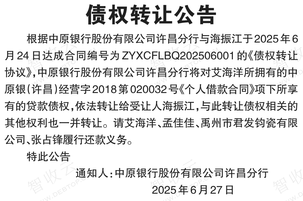 转让公告债权转让公告 银行转出禹州市君发钧瓷有限公司,债权转让公告,公告日期:2025-06-27,转让方:中原银行股份有限公司许昌分行,受让方:海振江,资产总额:0.0万元。艾海洋,孟佳佳等2户。来源:河南法制报 公告日期:2025-06-27债权金额债权本金户数2户所涉债务企业禹州市君发钧瓷有限公司