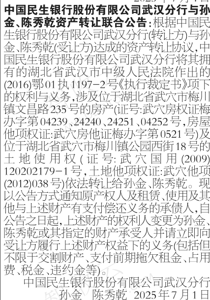 转让公告中国民生银行股份有限公司武汉分行与孙金、陈秀乾资产转让联合公告 银行转出,中国民生银行股份有限公司武汉分行与孙金、陈秀乾资产转让联合公告,公告日期:2025-07-07,转让方:中国民生银行股份有限公司武汉分行,受让方:孙金,陈秀乾,资产总额:0.0万元。来源:国际商报 公告日期:2025-07-07债权金额债权本金户数0户