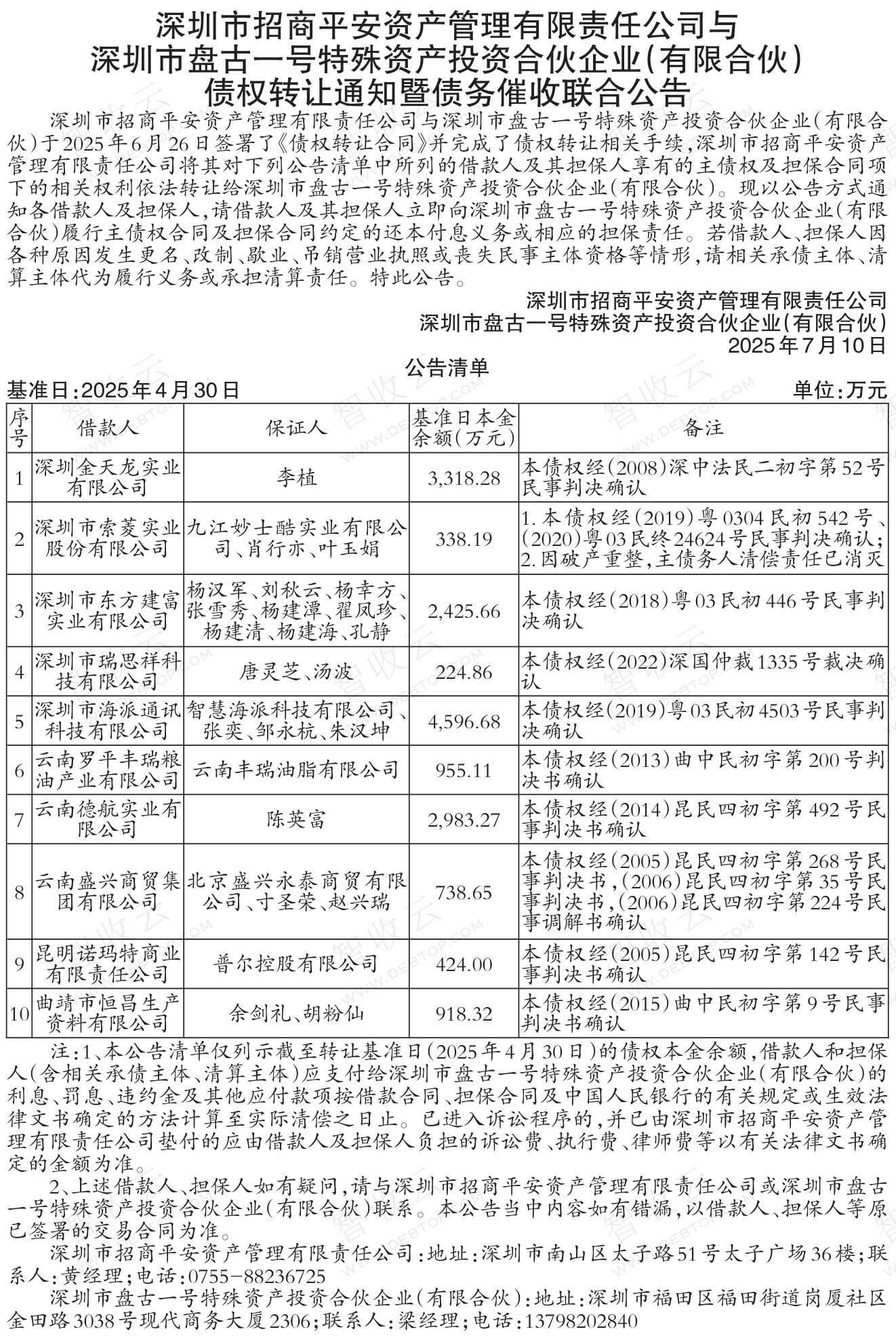 曲靖市恒昌生产资料有限公司,深圳市瑞思祥科技有限公司,深圳市招商平安资产管理有限责任公司与深圳市盘古一号特殊资产投资合伙企业(有限合伙)债权转让通知暨债务催收联合公告,公告日期:2025-07-10,转让方:深圳市招商平安资产管理有限责任公司,受让方:深圳市盘古一号特殊资产投资合伙企业(有限合伙),资产总额:16923.0万元。