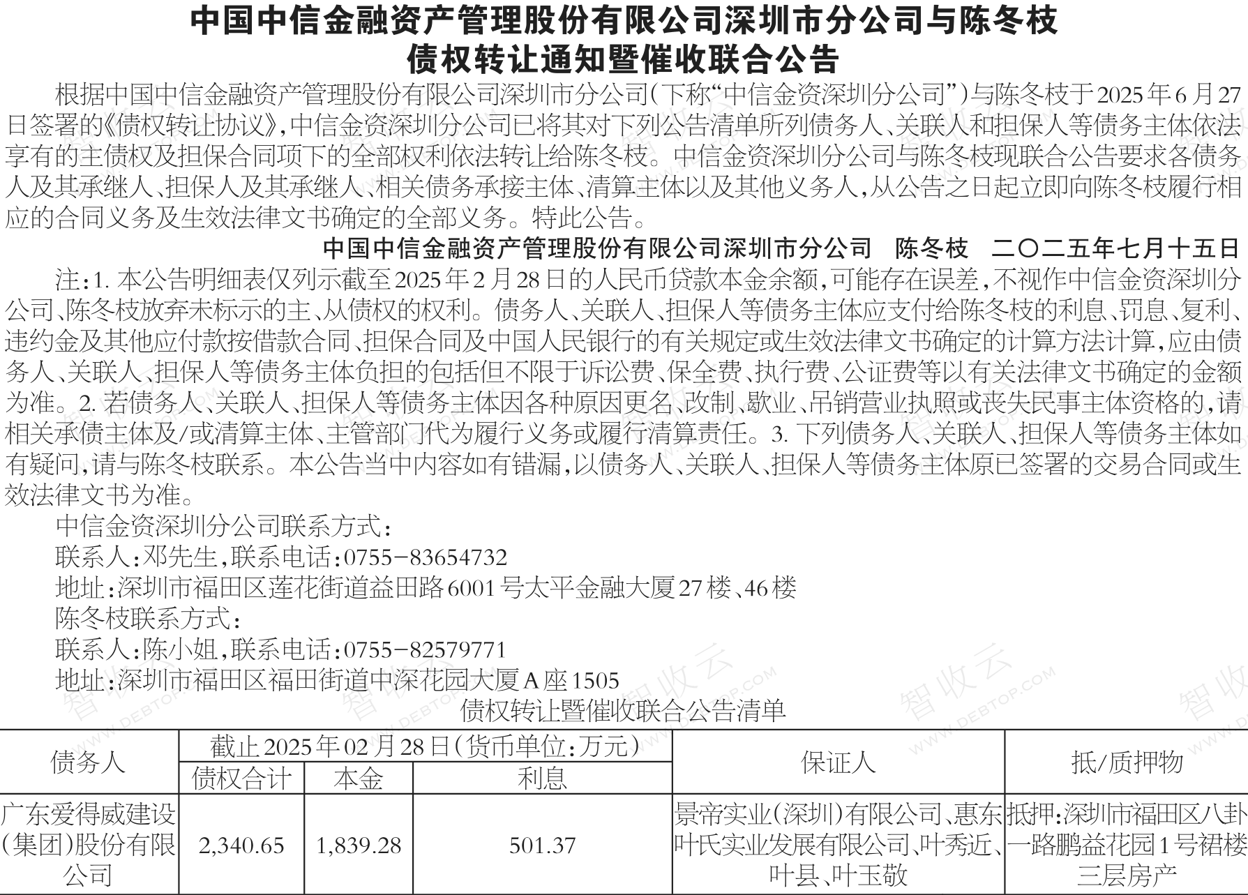 广东爱得威建设(集团)股份有限公司,景帝实业(深圳)有限公司,中国中信金融资产管理股份有限公司深圳市分公司与陈冬枝债权转让通知暨催收联合公告,公告日期:2025-07-15,转让方:中国中信金融资产管理股份有限公司深圳市分公司,受让方:陈冬枝,资产总额:2340.7万元。