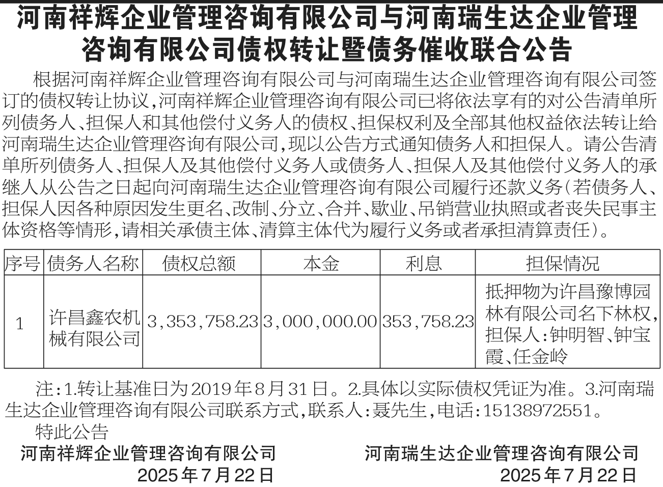 许昌鑫农机械有限公司河南祥辉企业管理咨询有限公司与河南瑞生达企业管理咨询有限公司债权转让暨债务催收联合公告