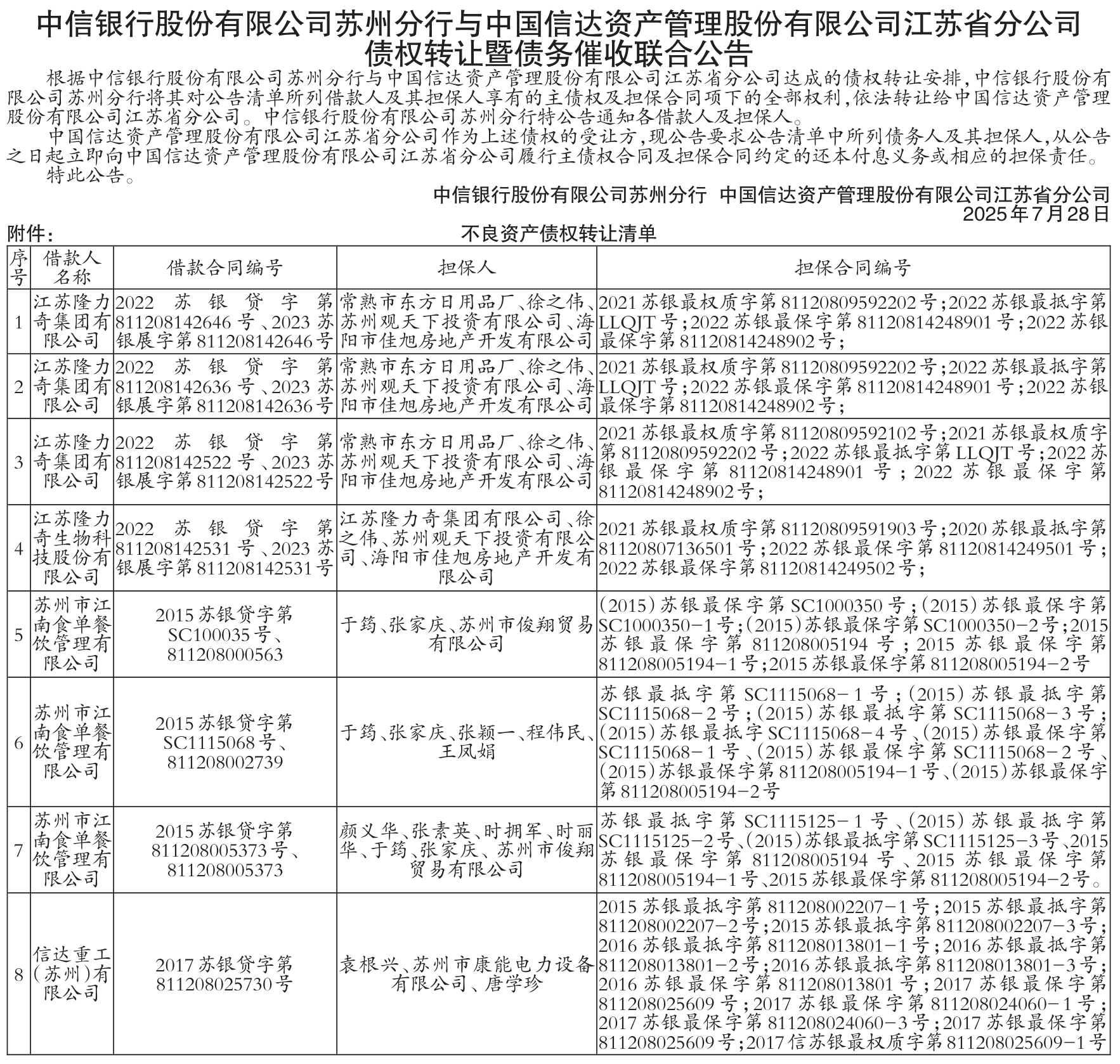 信达重工(苏州)有限公司,江苏隆力奇生物科技股份有限公司,中信银行股份有限公司苏州分行与中国信达资产管理股份有限公司江苏省分公司债权转让暨债务催收联合公告,公告日期:2025-07-28,转让方:中信银行股份有限公司苏州分行,受让方:中国信达资产管理股份有限公司江苏省分公司,资产总额:0.0万元。