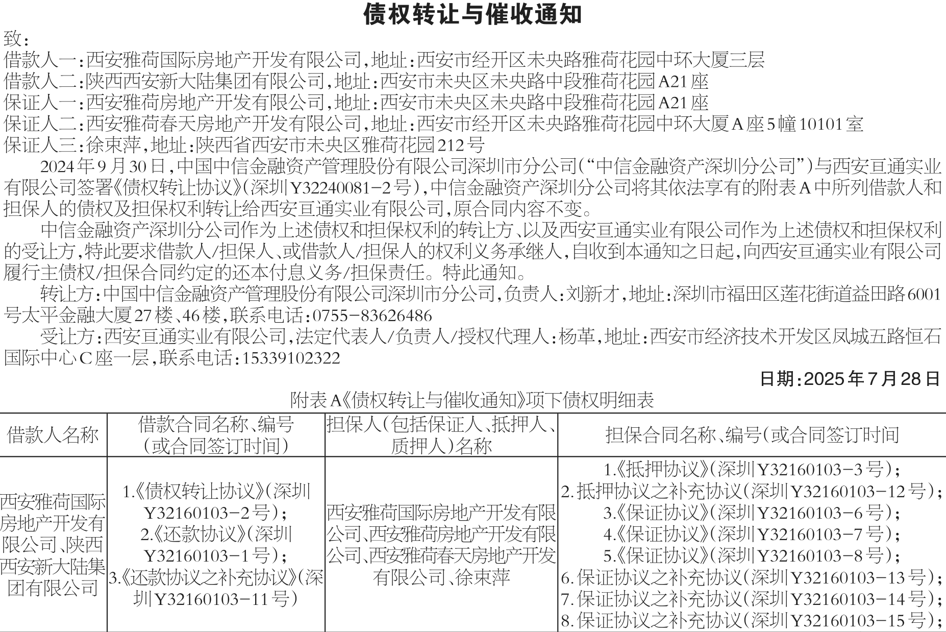 陕西西安新大陆集团有限公司,西安雅荷国际房地产开发有限公司,债权转让与催收通知,公告日期:2025-07-28,转让方:中国中信金融资产管理股份有限公司深圳市分公司,受让方:西安亘通实业有限公司,资产总额:0.0万元。