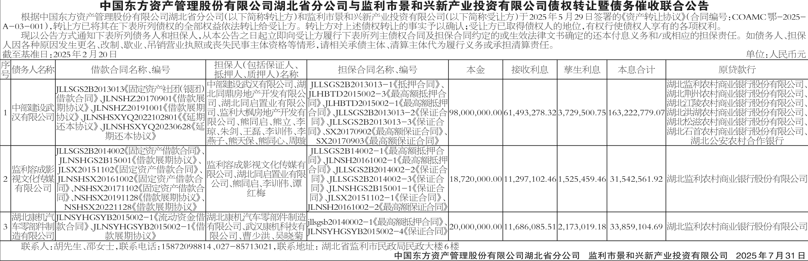 中部建设武汉有限公司,监利容成影视文化传媒有限公司,中国东方资产管理股份有限公司湖北省分公司与监利市景和兴新产业投资有限公司债权转让暨债务催收联合公告,公告日期:2025-07-31,转让方:中国东方资产管理股份有限公司湖北省分公司,受让方:监利市景和兴新产业投资有限公司,资产总额:22862.4万元。