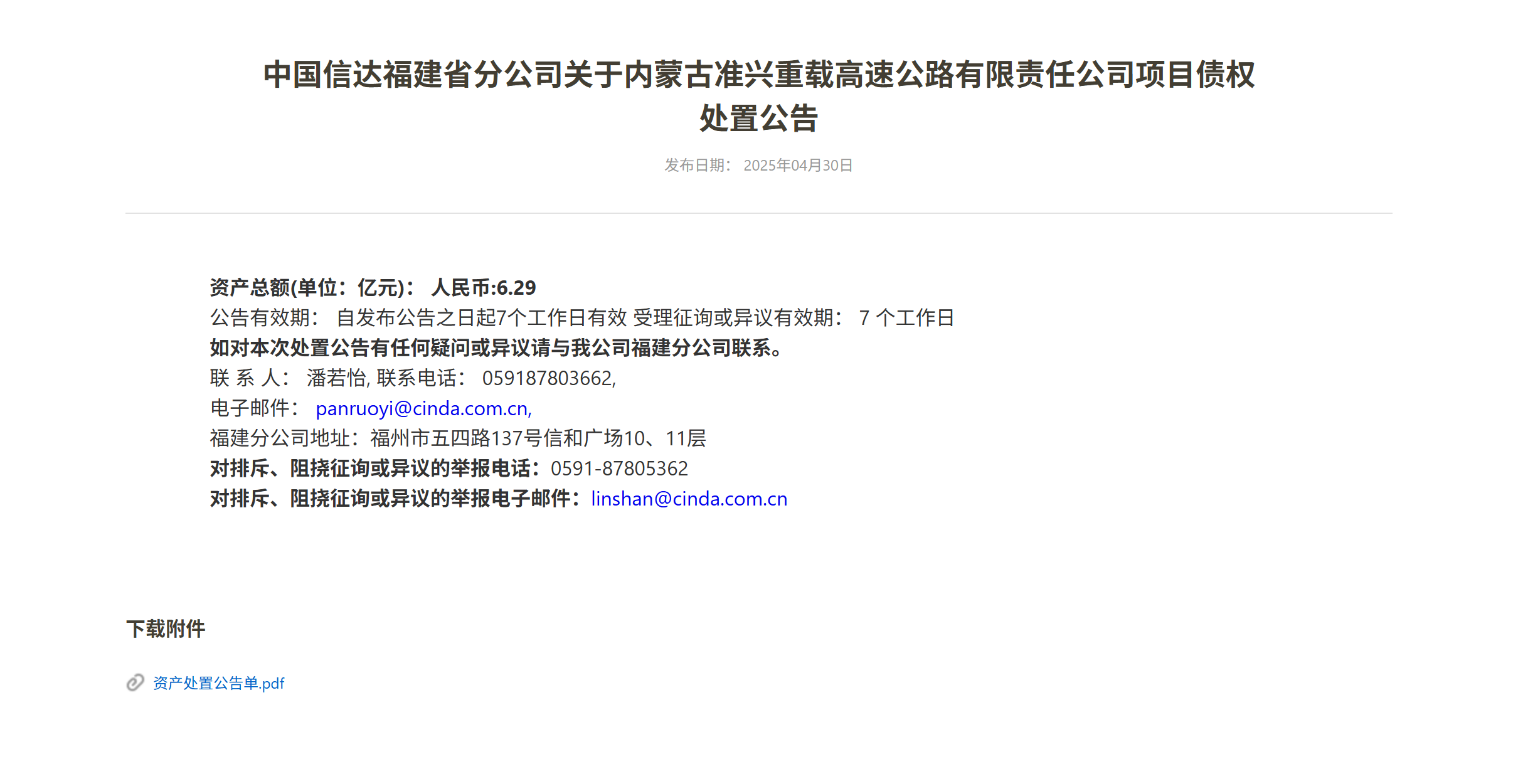 内蒙古准兴重载高速公路有限责任公司,中国资源交通集团有限公司,中国信达福建省分公司关于内蒙古准兴重载高速公路有限责任公司项目债权处置公告,公告日期:2025-04-30,债权方:中国信达资产管理股份有限公司福建省分公司,资产总额:63128.6万元。