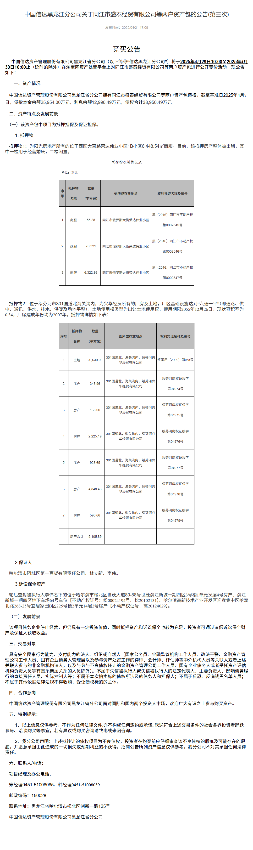 来源:中国信达黑龙江分公司(阿里资产) 公告日期:2025-04-21