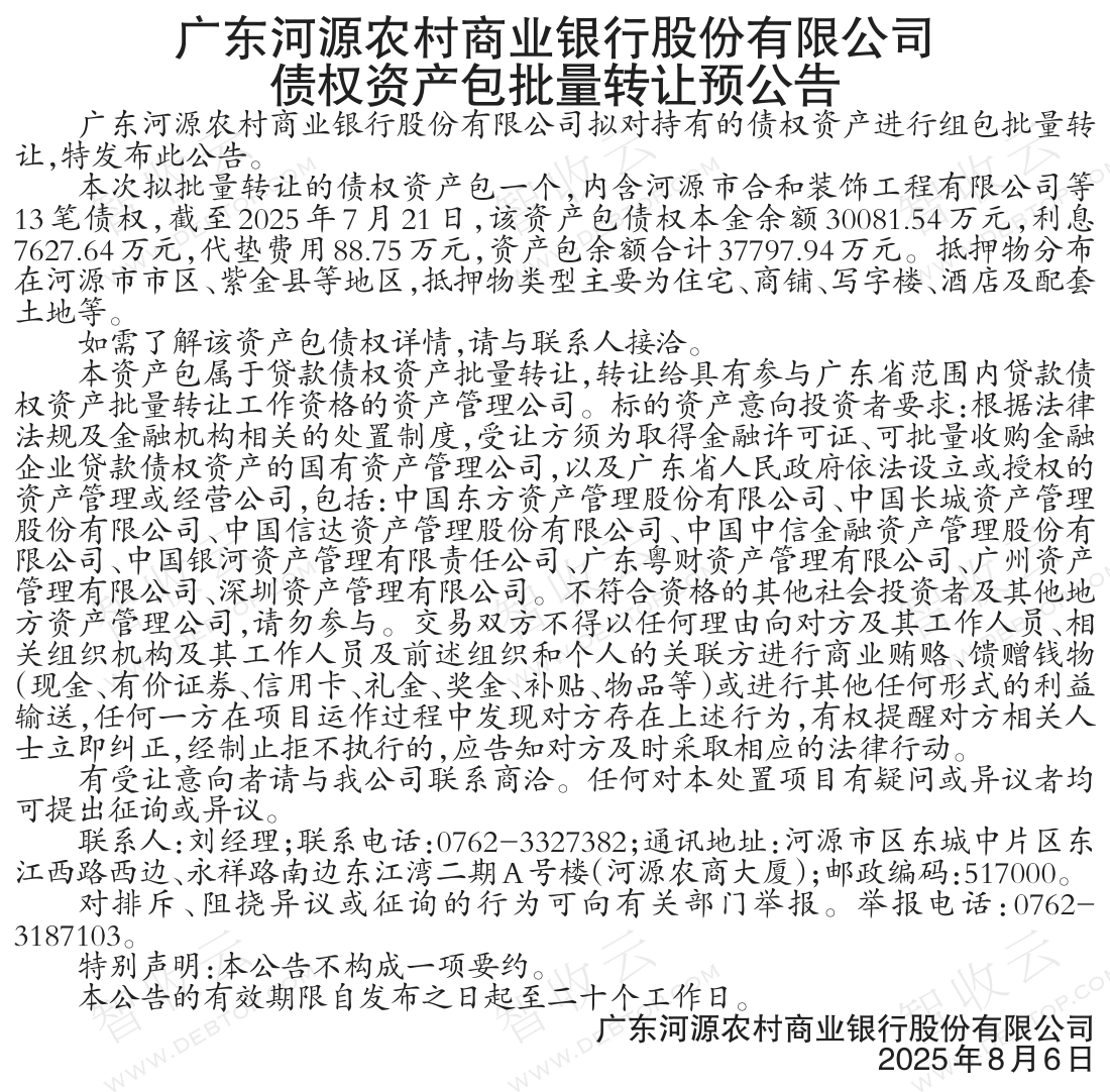 河源市合和装饰工程有限公司,广东河源农村商业银行股份有限公司债权资产包批量转让预公告,公告日期:2025-08-06,债权方:广东河源农村商业银行股份有限公司,资产总额:37797.9万元。