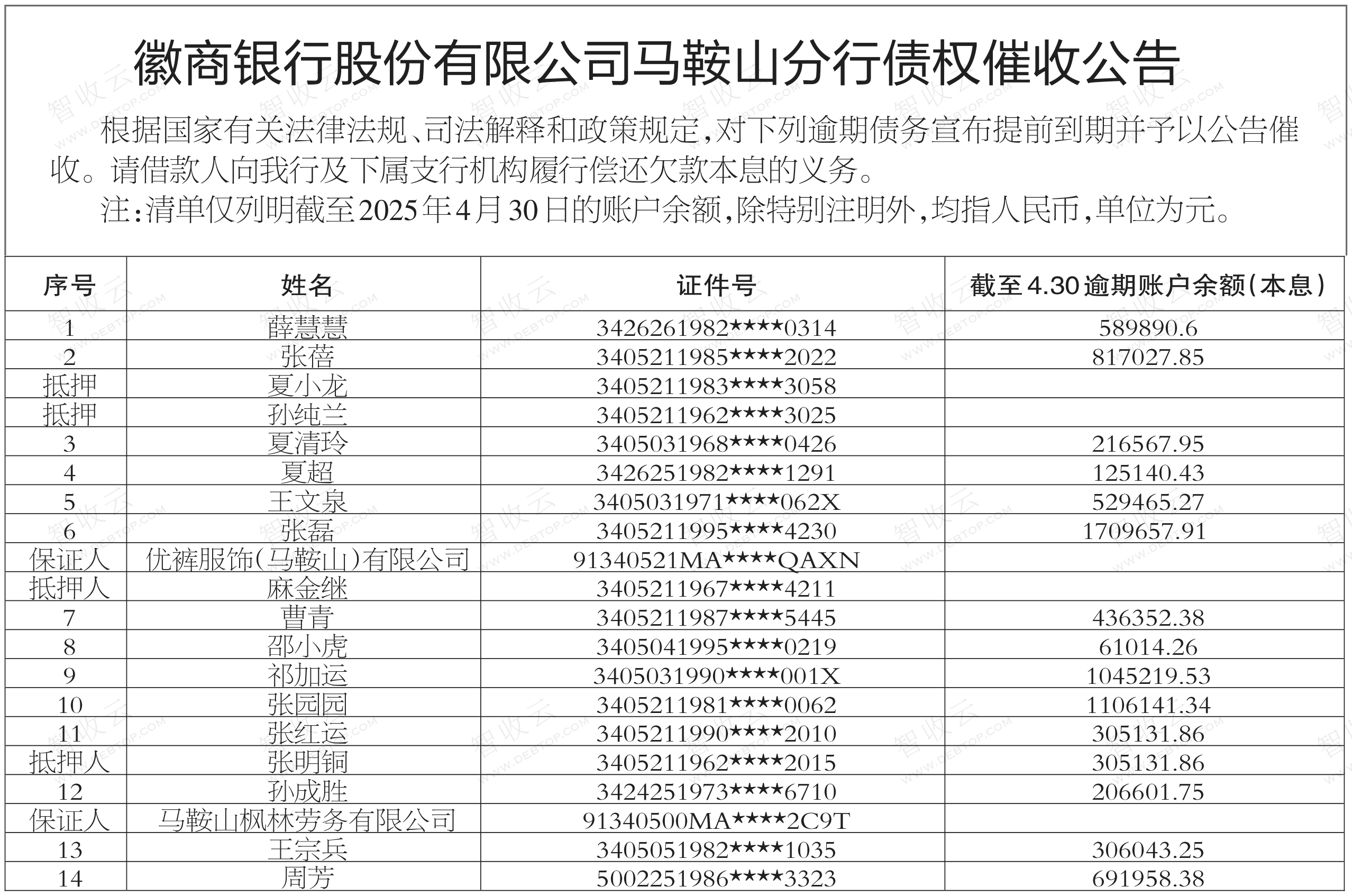 催收公告优裤服饰(马鞍山)有限公司,马鞍山枫林劳务有限公司徽商银行股份有限公司马鞍山分行债权催收公告 优裤服饰(马鞍山)有限公司,马鞍山枫林劳务有限公司,徽商银行股份有限公司马鞍山分行债权催收公告,公告日期:2025-05-28,债权方:徽商银行股份有限公司马鞍山分行,资产总额:845.1万元。薛慧慧,张蓓,夏小龙等20户。来源:安徽法治报 公告日期:2025-05-28债权金额845.13万债权本金户数20户所涉债务企业优裤服饰(马鞍山)有限公司马鞍山枫林劳务有限公司