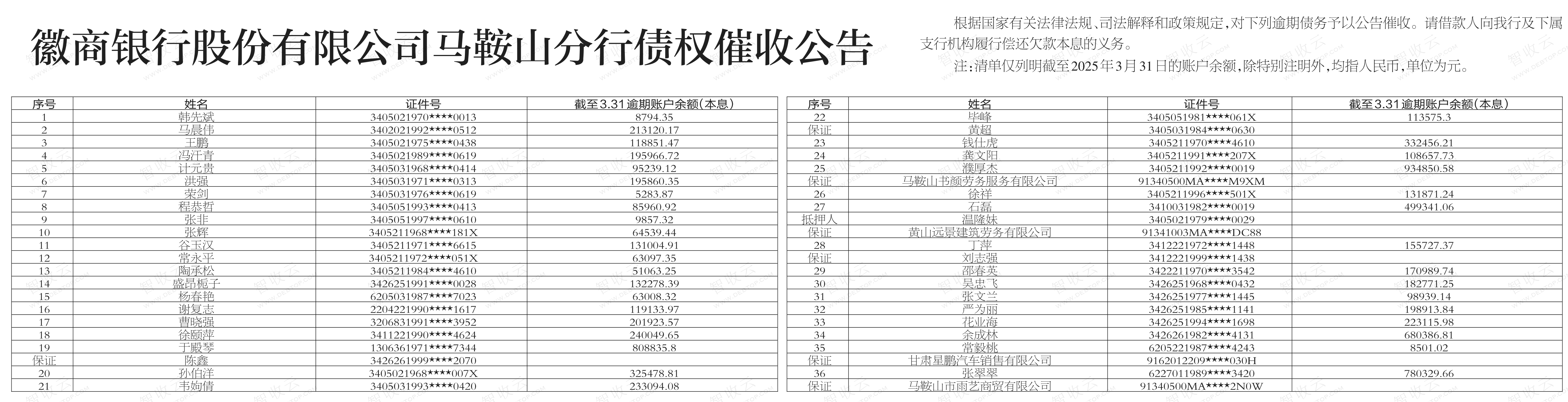 催收公告马鞍山书颜劳务服务有限公司,黄山远景建筑劳务有限公司徽商银行股份有限公司马鞍山分行债权催收公告 马鞍山书颜劳务服务有限公司,黄山远景建筑劳务有限公司,徽商银行股份有限公司马鞍山分行债权催收公告,公告日期:2025-04-25,债权方:徽商银行股份有限公司马鞍山分行,资产总额:798.3万元。韩先斌,马晨伟,王鹏等44户。来源:安徽法治报 公告日期:2025-04-25债权金额798.28万债权本金户数44户所涉债务企业马鞍山书颜劳务服务有限公司黄山远景建筑劳务有限公司甘肃星鹏汽车销售有限公司马鞍山市雨艺商贸有限公司