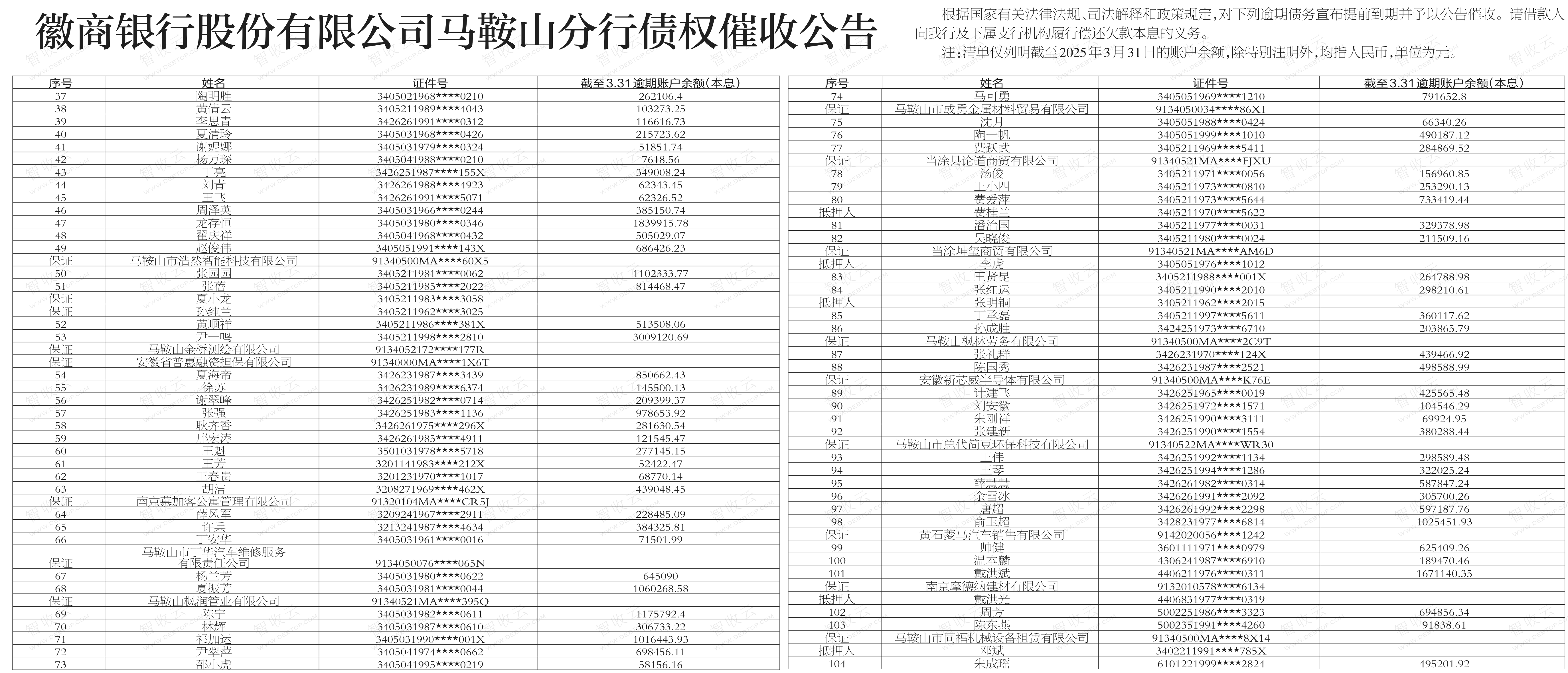 催收公告马鞍山枫林劳务有限公司,马鞍山枫润管业有限公司徽商银行股份有限公司马鞍山分行债权催收公告 马鞍山枫林劳务有限公司,马鞍山枫润管业有限公司,徽商银行股份有限公司马鞍山分行债权催收公告,公告日期:2025-04-25,债权方:徽商银行股份有限公司马鞍山分行,资产总额:3242.5万元。陶明胜,黄倩云,李思青等90户。来源:安徽法治报 公告日期:2025-04-25债权金额3,242.45万债权本金户数90户所涉债务企业马鞍山枫林劳务有限公司马鞍山枫润管业有限公司马鞍山市浩然智能科技有限公司马鞍山金桥测绘有限公司安徽省普惠融资担保有限公司南京慕加客公寓管理有限公司马鞍山市丁华汽车维修服务有限责任公司马鞍山市成勇金属材料贸易有限公司当涂县论道商贸有限公司当涂坤玺商贸有限公司查看更多