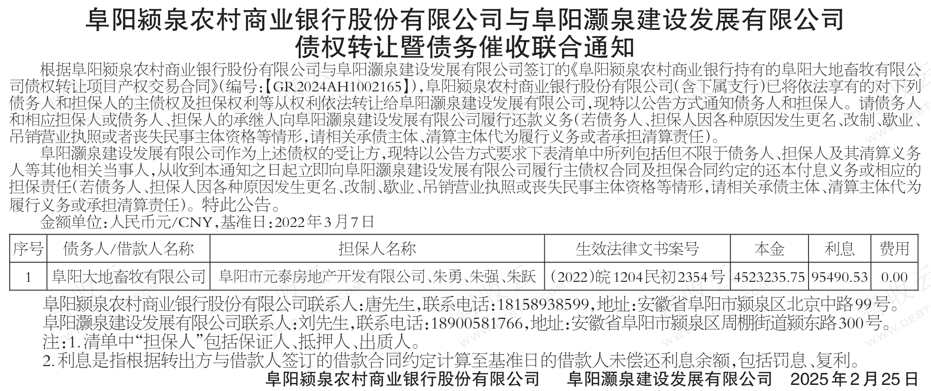 阜阳大地畜牧有限公司,阜阳市元泰房地产开发有限公司,阜阳颍泉农村商业银行股份有限公司与阜阳灏泉建设发展有限公司债权转让暨债务催收联合通知,公告日期:2025-02-25,转让方:阜阳颍泉农村商业银行股份有限公司,受让方:阜阳灏泉建设发展有限公司,资产总额:461.9万元。