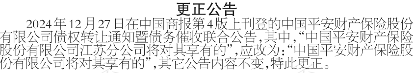 ,更正公告,公告日期:2024-12-31,债权方:中国平安财产保险股份有限公司,资产总额:0.0万元。