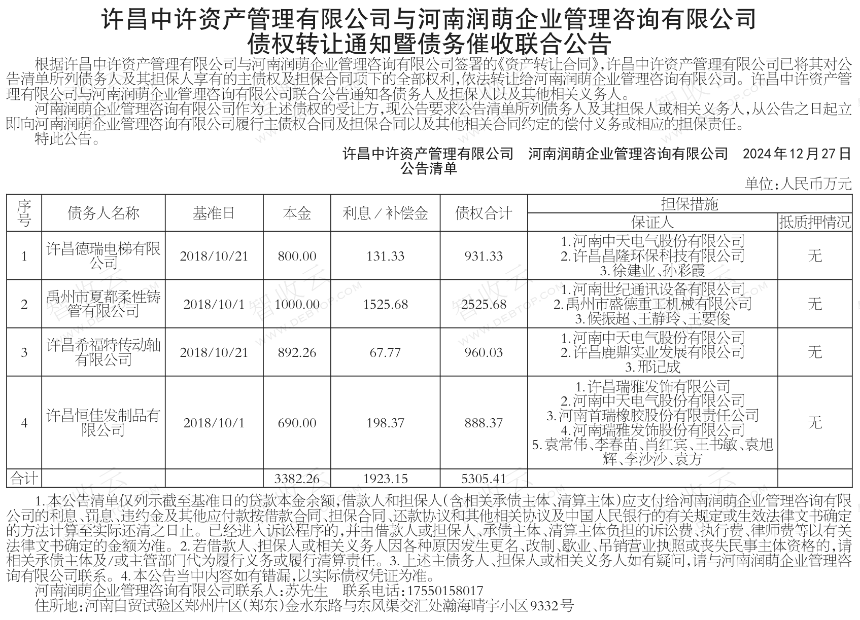 许昌德瑞电梯有限公司,禹州市夏都柔性铸管有限公司,许昌中许资产管理有限公司与河南润萌企业管理咨询有限公司债权转让通知暨债务催收联合公告,公告日期:2024-12-27,转让方:许昌中许资产管理有限公司,受让方:河南润萌企业管理咨询有限公司,资产总额:5305.4万元。