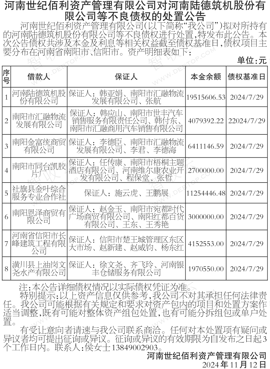 河南陆德筑机股份有限公司,南阳市汇融物流发展有限公司,河南世纪佰利资产管理有限公司对河南陆德筑机股份有限公司等不良债权的处置公告,公告日期:2024-11-13,债权方:河南世纪佰利资产管理有限公司,资产总额:5308.4万元。