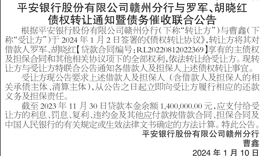 转让公告债权转让通知暨债务催收联合公告 银行转出,债权转让通知暨债务催收联合公告,公告日期:2024-01-11,转让方:平安银行股份有限公司赣州分行,受让方:曹鑫,资产总额:140.0万元。罗军等1户。来源:中国商报 公告日期:2024-01-11债权金额140万债权本金140万户数1户