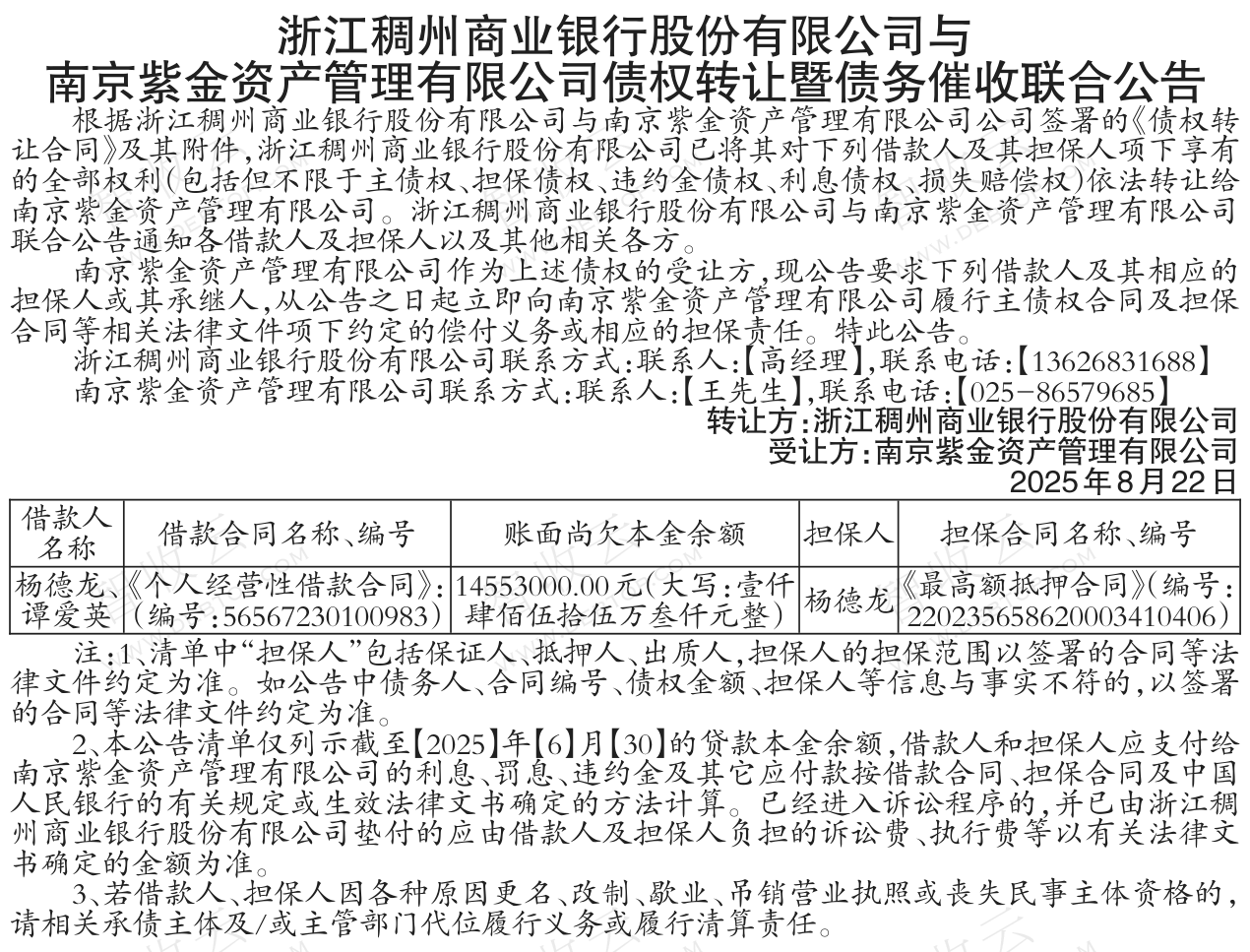 浙江稠州商业银行股份有限公司与南京紫金资产管理有限公司债权转让暨债务催收联合公告 银行转出