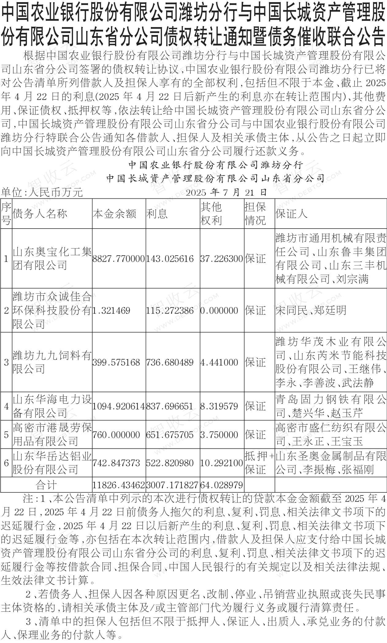 山东华岳达铝业股份有限公司,高密市港晟劳保用品有限公司中国农业银行股份有限公司潍坊分行与中国长城资产管理股份有限公司山东省分公司债权转让通知暨债务催收联合公告 银行转出