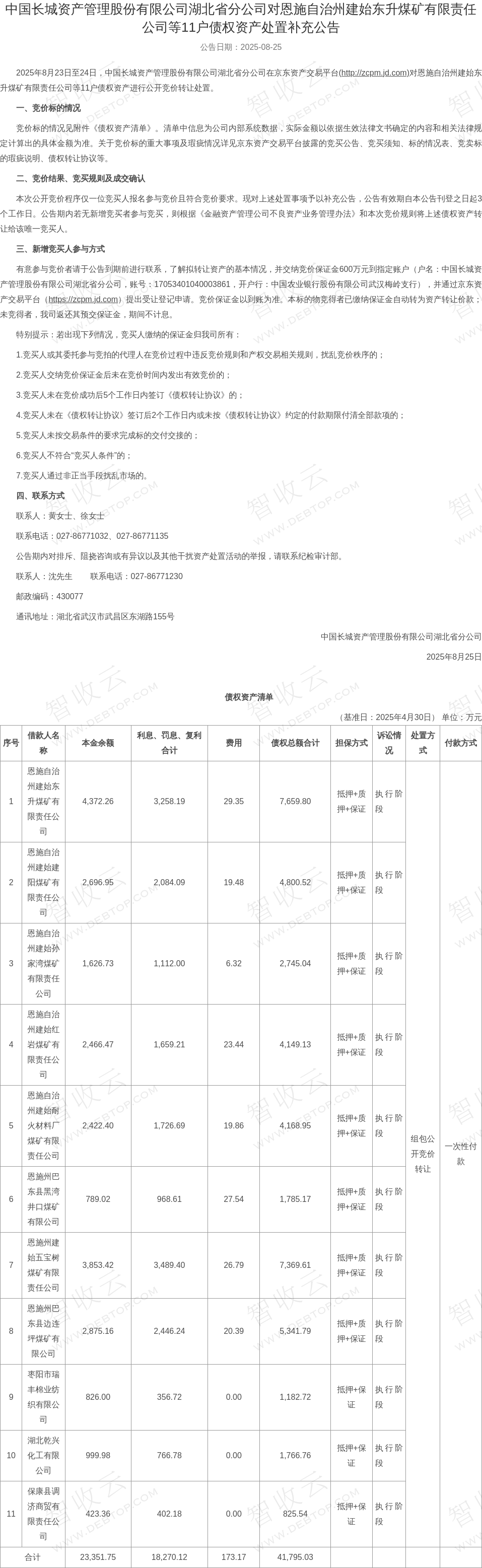 枣阳市瑞丰棉业纺织有限公司,湖北乾兴化工有限公司,中国长城资产管理股份有限公司湖北省分公司对恩施自治州建始东升煤矿有限责任公司等11户债权资产处置补充公告,公告日期:2025-08-25,债权方:中国长城资产管理股份有限公司湖北省分公司,资产总额:41795.0万元。