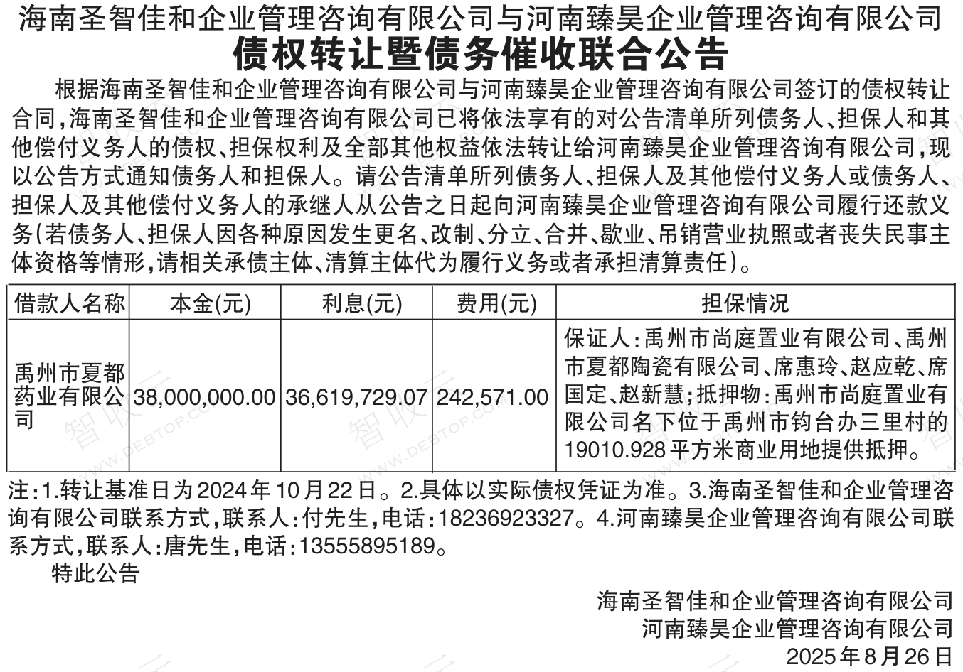 禹州市夏都药业有限公司,禹州市尚庭置业有限公司,海南圣智佳和企业管理咨询有限公司与河南臻昊企业管理咨询有限公司债权转让暨债务催收联合公告,公告日期:2025-08-26,转让方:海南圣智佳和企业管理咨询有限公司,受让方:河南臻昊企业管理咨询有限公司,资产总额:7486.2万元。