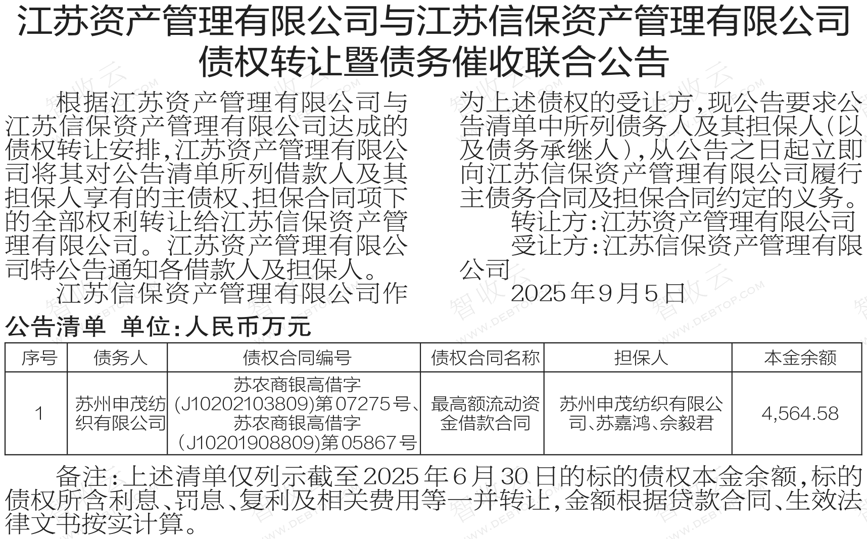 苏州申茂纺织有限公司,江苏资产管理有限公司与江苏信保资产管理有限公司债权转让暨债务催收联合公告,公告日期:2025-09-05,转让方:江苏资产管理有限公司,受让方:江苏信保资产管理有限公司,资产总额:4564.6万元。