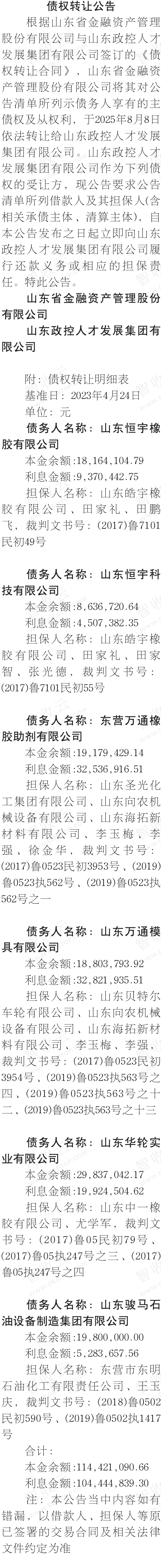 东营万通橡胶助剂有限公司,山东万通模具有限公司,债权转让公告,公告日期:2025-09-12,转让方:山东省金融资产管理股份有限公司,受让方:山东政控人才发展集团有限公司,资产总额:21886.6万元。