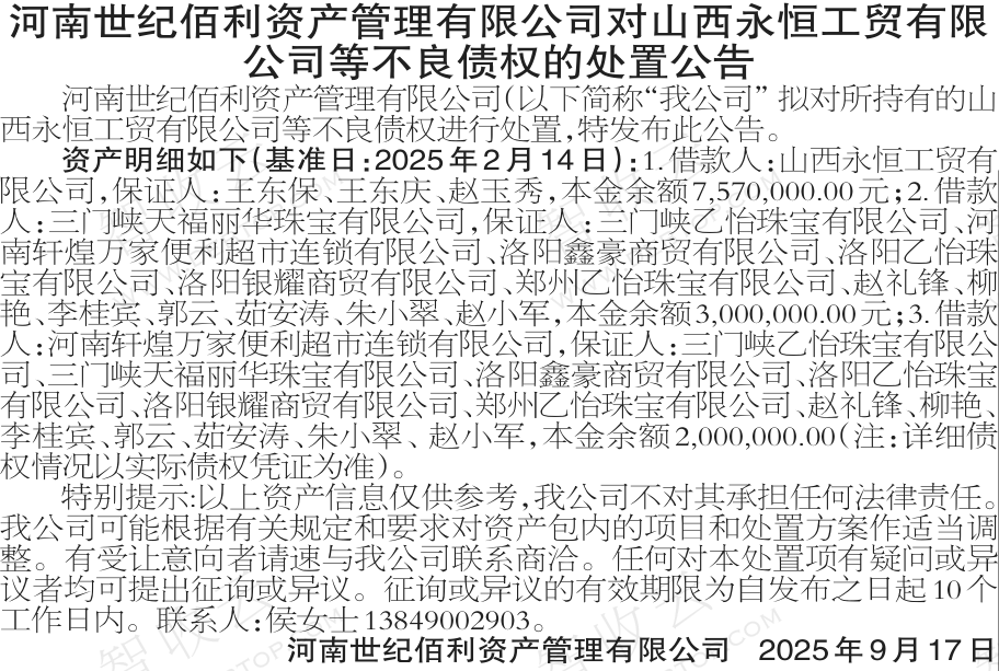 河南轩煌万家便利超市连锁有限公司,山西永恒工贸有限公司,河南世纪佰利资产管理有限公司对山西永恒工贸有限公司等不良债权的处置公告,公告日期:2025-09-17,债权方:河南世纪佰利资产管理有限公司,资产总额:1257.0万元。