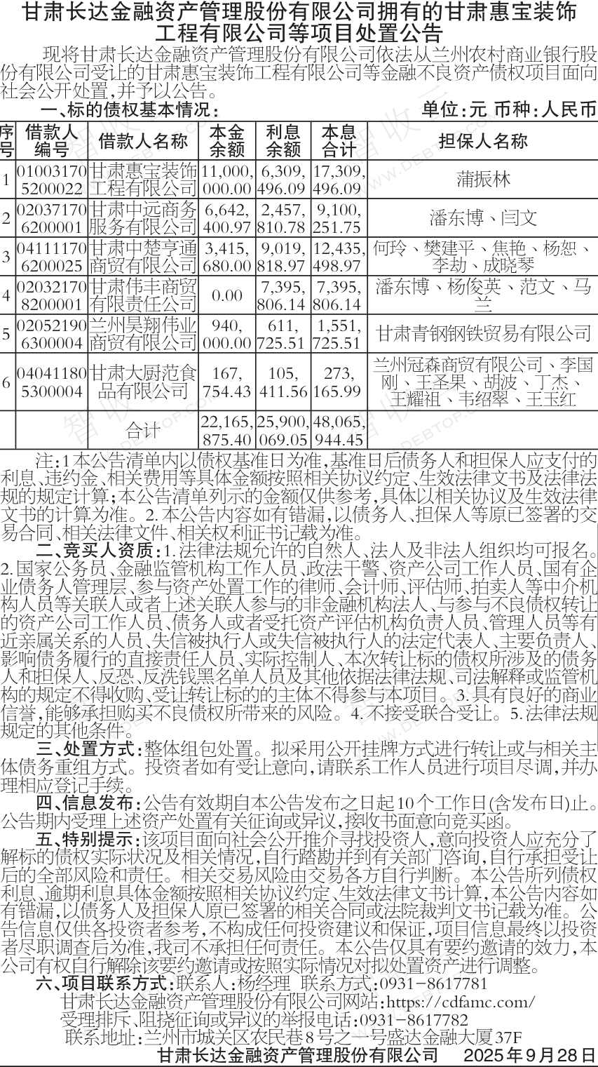 甘肃惠宝装饰工程有限公司,甘肃中远商务服务有限公司,甘肃长达金融资产管理股份有限公司拥有的甘肃惠宝装饰工程有限公司等项目处置公告,公告日期:2025-09-30,债权方:兰州农村商业银行股份有限公司,资产总额:4806.6万元。