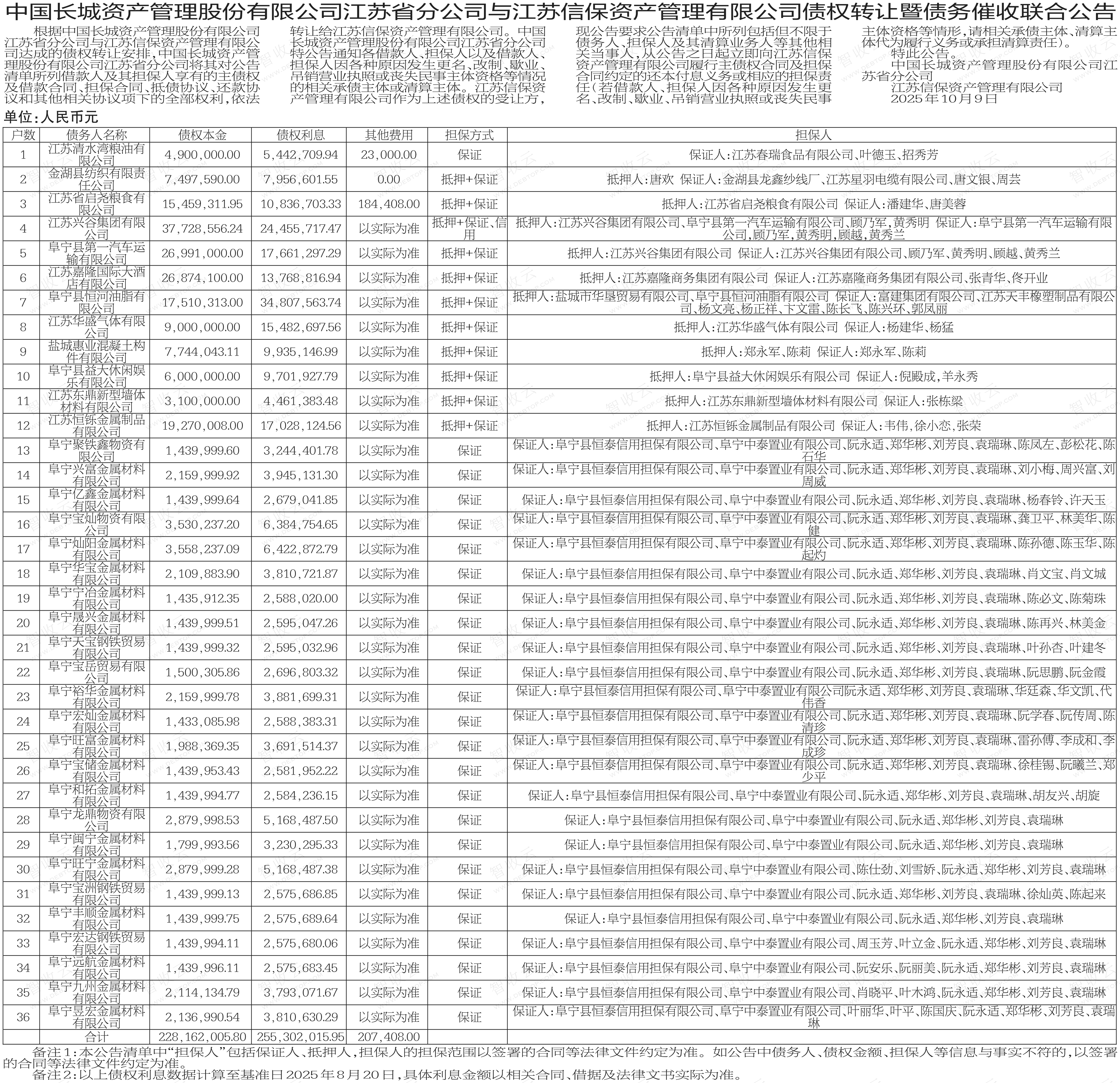 江苏清水湾粮油有限公司,金湖县纺织有限责任公司中国长城资产管理股份有限公司江苏省分公司与江苏信保资产管理有限公司债权转让暨债务催收联合公告 AMC转出