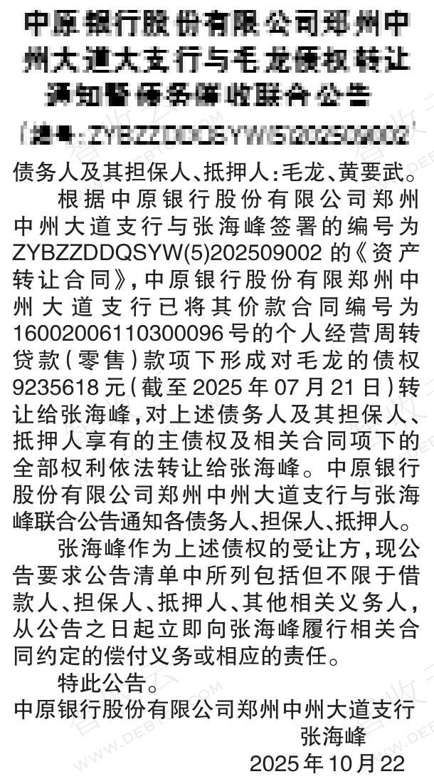 转让公告中原银行股份有限公司郑州中州大道大支行与毛龙债权转让通知暨债务催收联合公告 银行转出,中原银行股份有限公司郑州中州大道大支行与毛龙债权转让通知暨债务催收联合公告,公告日期:2025-10-22,转让方:中原银行股份有限公司郑州中州大道支行,受让方:张海峰,资产总额:923.6万元。毛龙等1户。来源:河南法制报 公告日期:2025-10-22债权金额923.56万债权本金户数1户