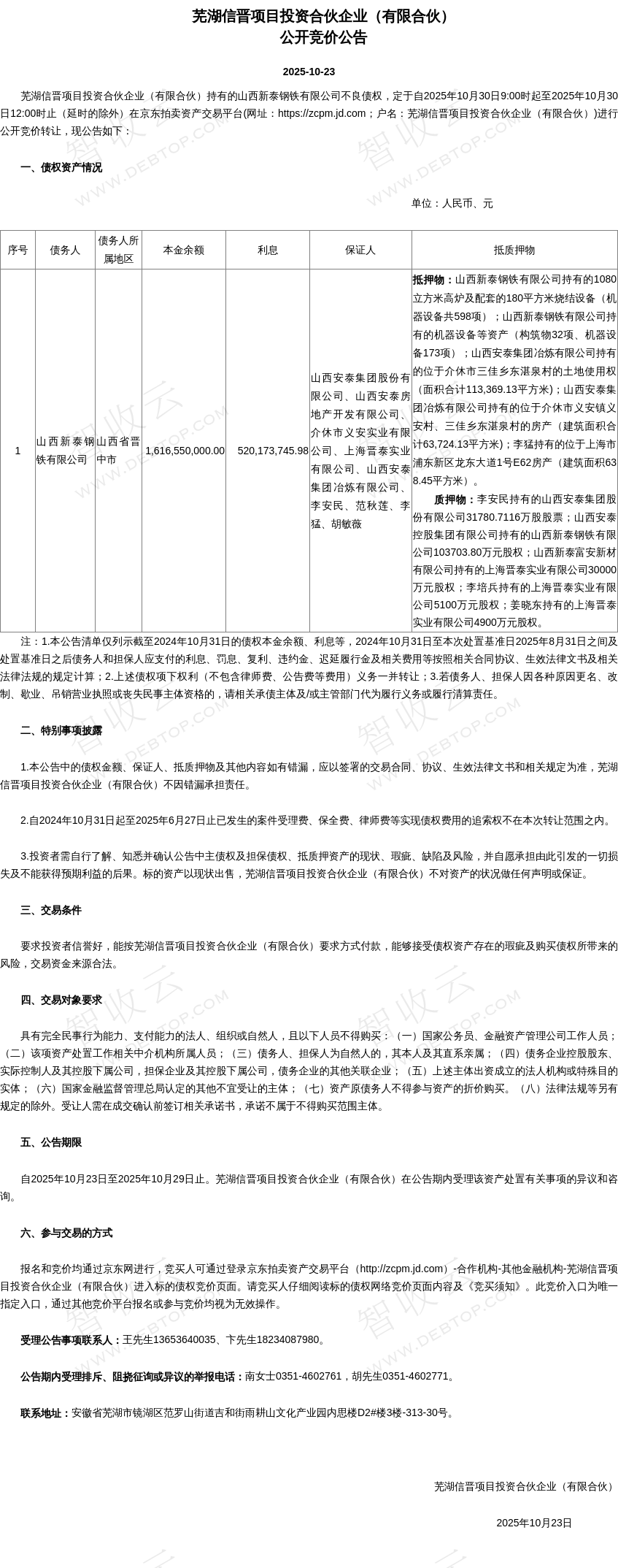山西新泰钢铁有限公司,山西安泰集团股份有限公司,芜湖信晋项目投资合伙企业(有限合伙)公开竞价公告,公告日期:2025-10-23,债权方:芜湖信晋项目投资合伙企业(有限合伙),资产总额:213672.4万元。