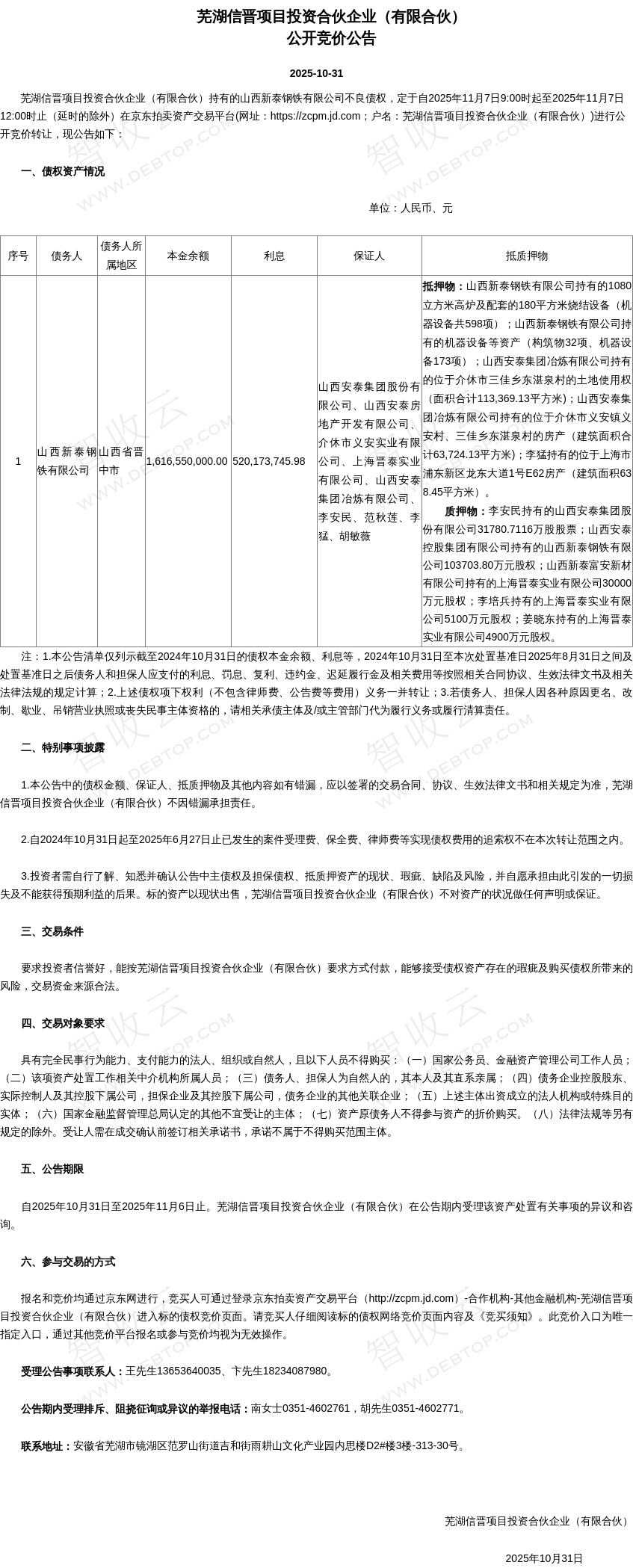 山西新泰钢铁有限公司,山西安泰集团股份有限公司,芜湖信晋项目投资合伙企业(有限合伙)公开竞价公告,公告日期:2025-10-31,债权方:芜湖信晋项目投资合伙企业(有限合伙),资产总额:213672.4万元。