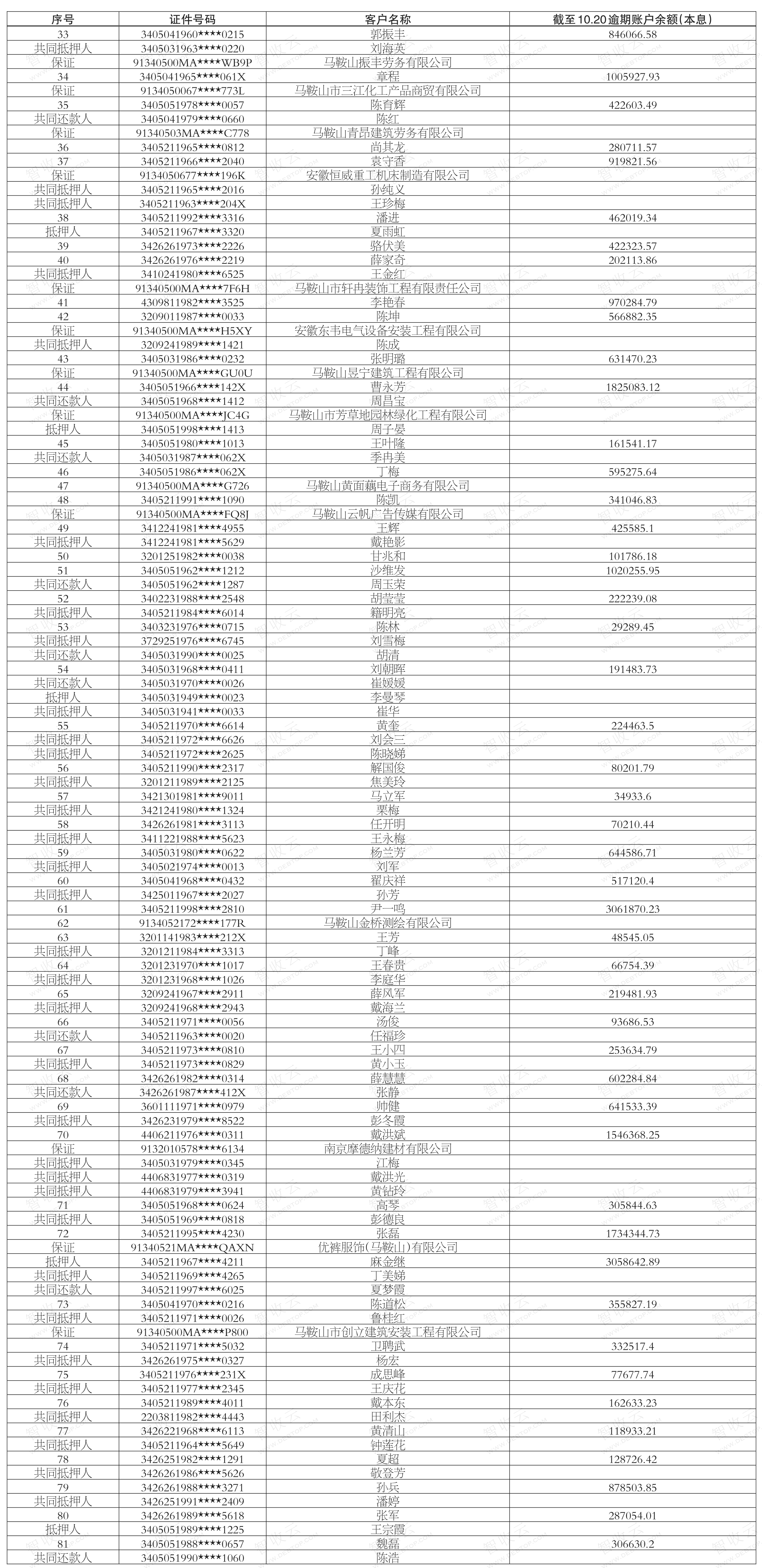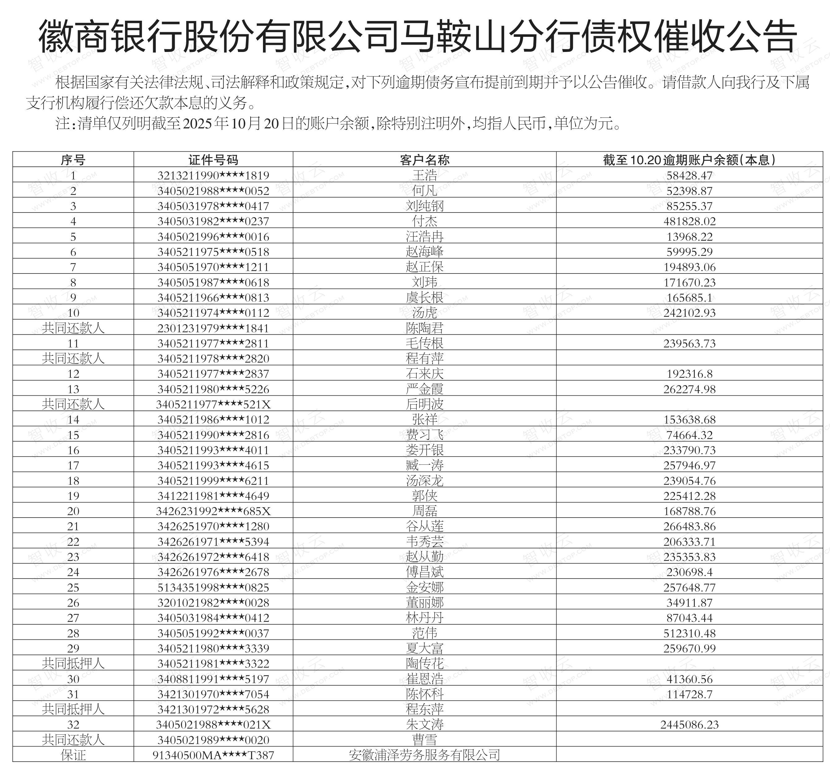 催收公告优裤服饰(马鞍山)有限公司,马鞍山金桥测绘有限公司徽商银行股份有限公司马鞍山分行债权催收公告 优裤服饰(马鞍山)有限公司,马鞍山金桥测绘有限公司,徽商银行股份有限公司马鞍山分行债权催收公告,公告日期:2025-11-04,债权方:徽商银行股份有限公司马鞍山分行,资产总额:3576.2万元。谷从莲,丁峰,帅健等148户。来源:安徽法治报 公告日期:2025-11-04债权金额3,576.21万债权本金户数148户所涉债务企业优裤服饰(马鞍山)有限公司马鞍山金桥测绘有限公司南京摩德纳建材有限公司马鞍山市创立建筑安装工程有限公司安徽浦泽劳务服务有限公司马鞍山振丰劳务有限公司马鞍山市三江化工产品商贸有限公司马鞍山青昂建筑劳务有限公司安徽恒威重工机床制造有限公司马鞍山市轩冉装饰工程有限责任公司查看更多