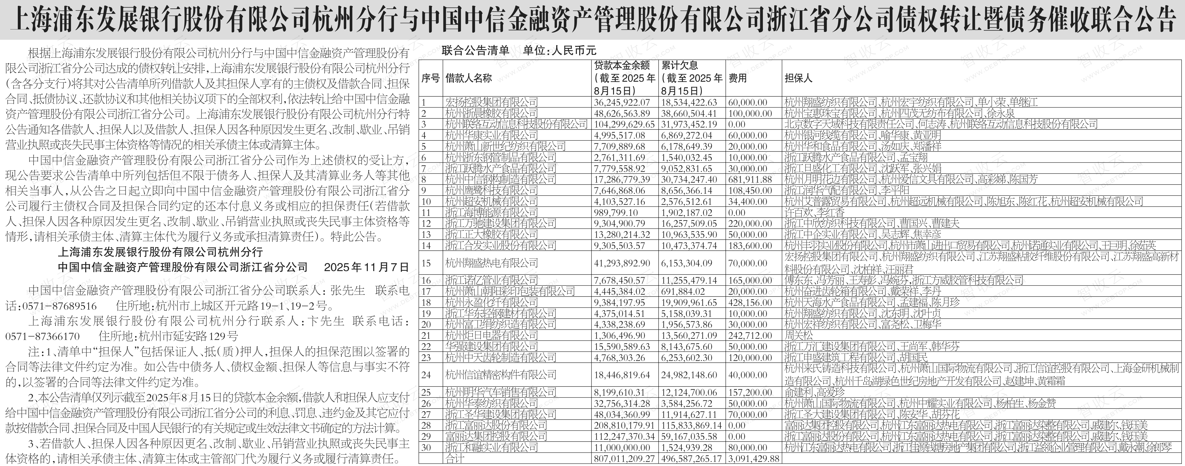 富丽达集团控股有限公司,杭州萧山新世纪纺织有限公司,上海浦东发展银行股份有限公司杭州分行与中国中信金融资产管理股份有限公司浙江省分公司债权转让暨债务催收联合公告,公告日期:2025-11-07,转让方:上海浦东发展银行股份有限公司杭州分行,受让方:中国中信金融资产管理股份有限公司浙江省分公司,资产总额:130669.0万元。
