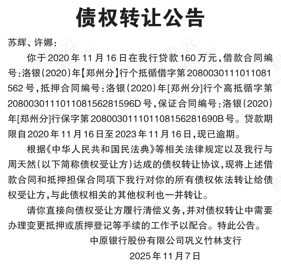转让公告债权转让公告 银行转出,债权转让公告,公告日期:2025-11-07,转让方:中原银行股份有限公司巩义竹林支行,受让方:周天然,资产总额:160.0万元。苏辉等1户。来源:河南法制报 公告日期:2025-11-07债权金额160万债权本金160万户数1户