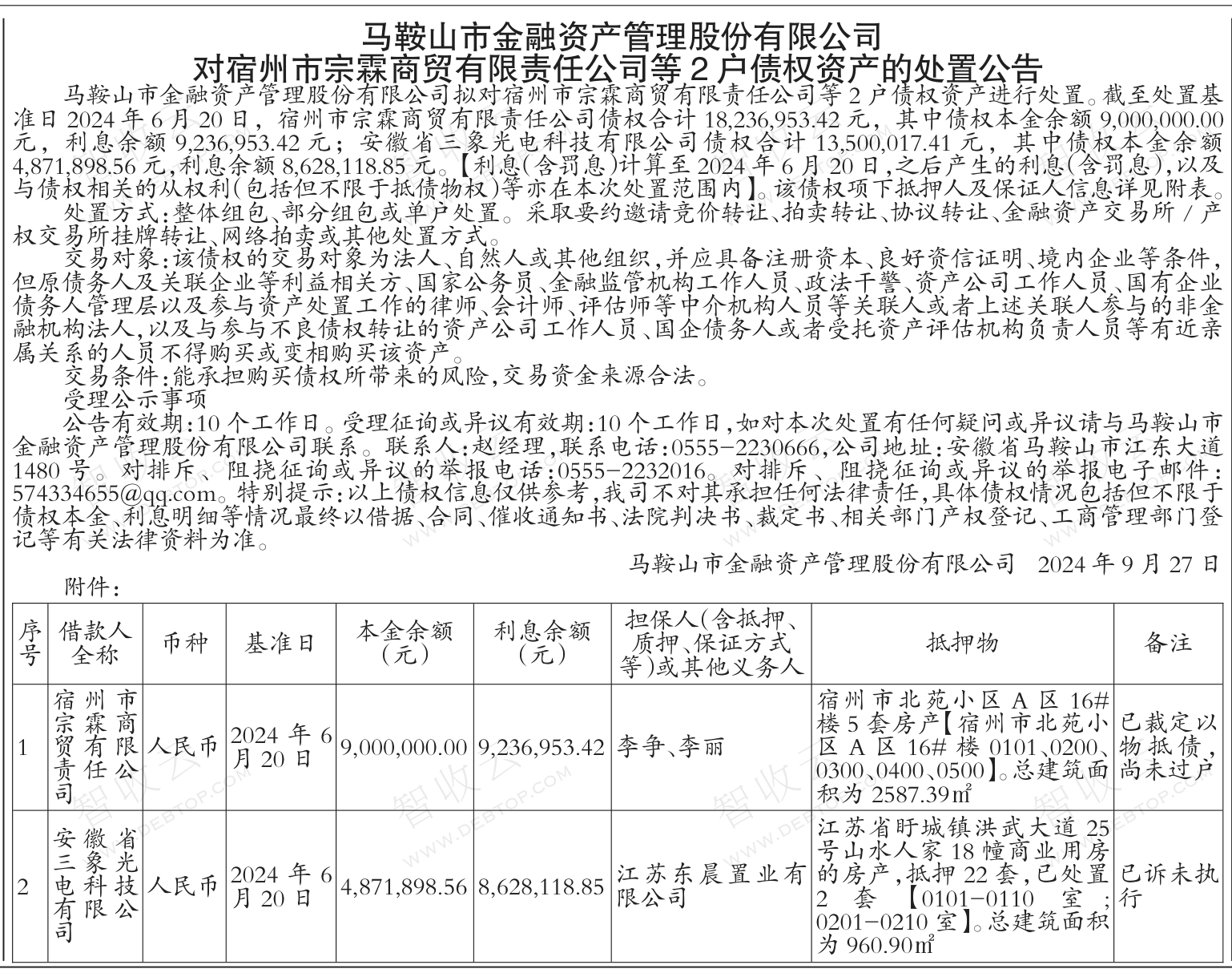 安徽省三象光电科技有限公司,宿州市宗霖商贸有限责任公司马鞍山市金融资产管理股份有限公司对宿州市宗霖商贸有限责任公司等2户债权资产的处置公告