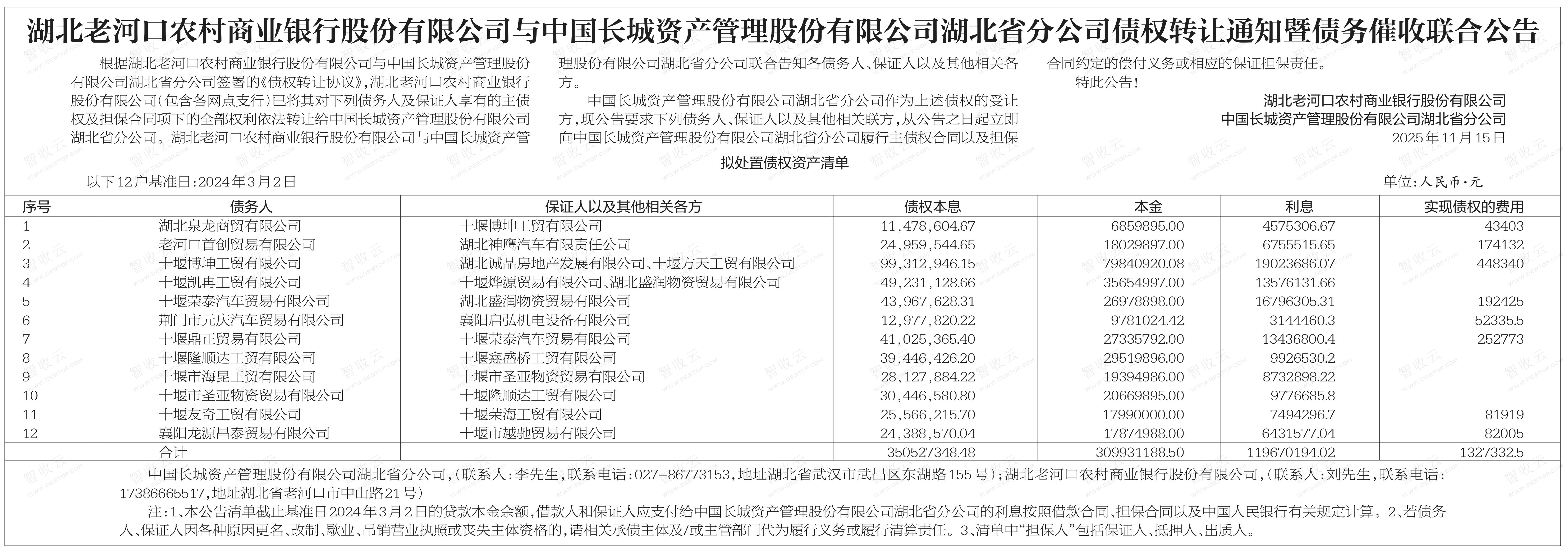 十堰鼎正贸易有限公司,十堰市海昆工贸有限公司湖北老河口农村商业银行股份有限公司与中国长城资产管理股份有限公司湖北省分公司债权转让通知暨债务催收联合公告 银行转出