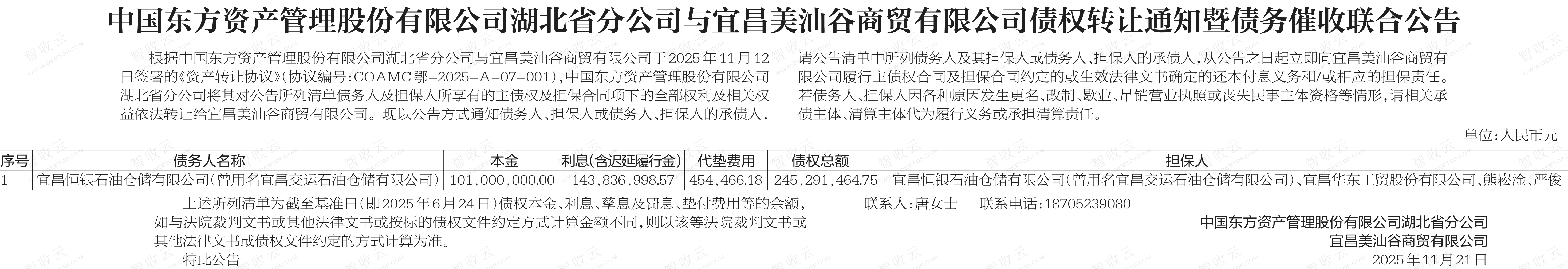 宜昌恒银石油仓储有限公司,宜昌华东工贸股份有限公司,中国东方资产管理股份有限公司湖北省分公司与宜昌美汕谷商贸有限公司债权转让通知暨债务催收联合公告,公告日期:2025-11-21,转让方:中国东方资产管理股份有限公司湖北省分公司,受让方:宜昌美汕谷商贸有限公司,资产总额:24529.1万元。