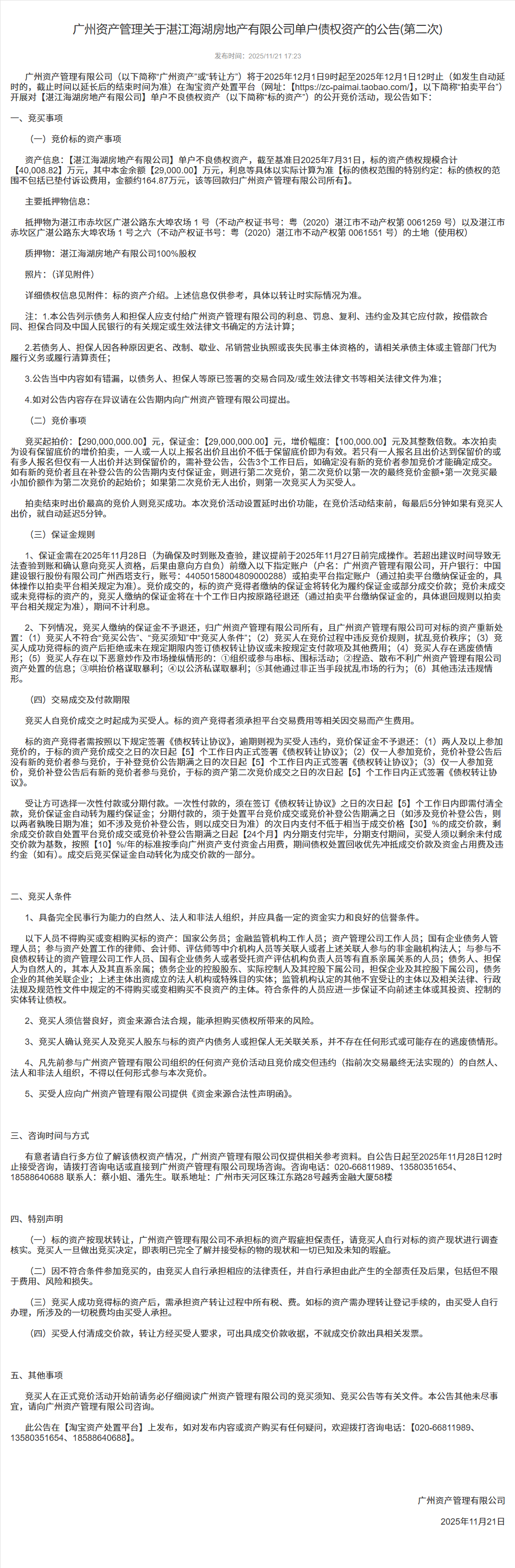 广州资产管理关于湛江海湖房地产有限公司单户债权资产的公告(第二次)
