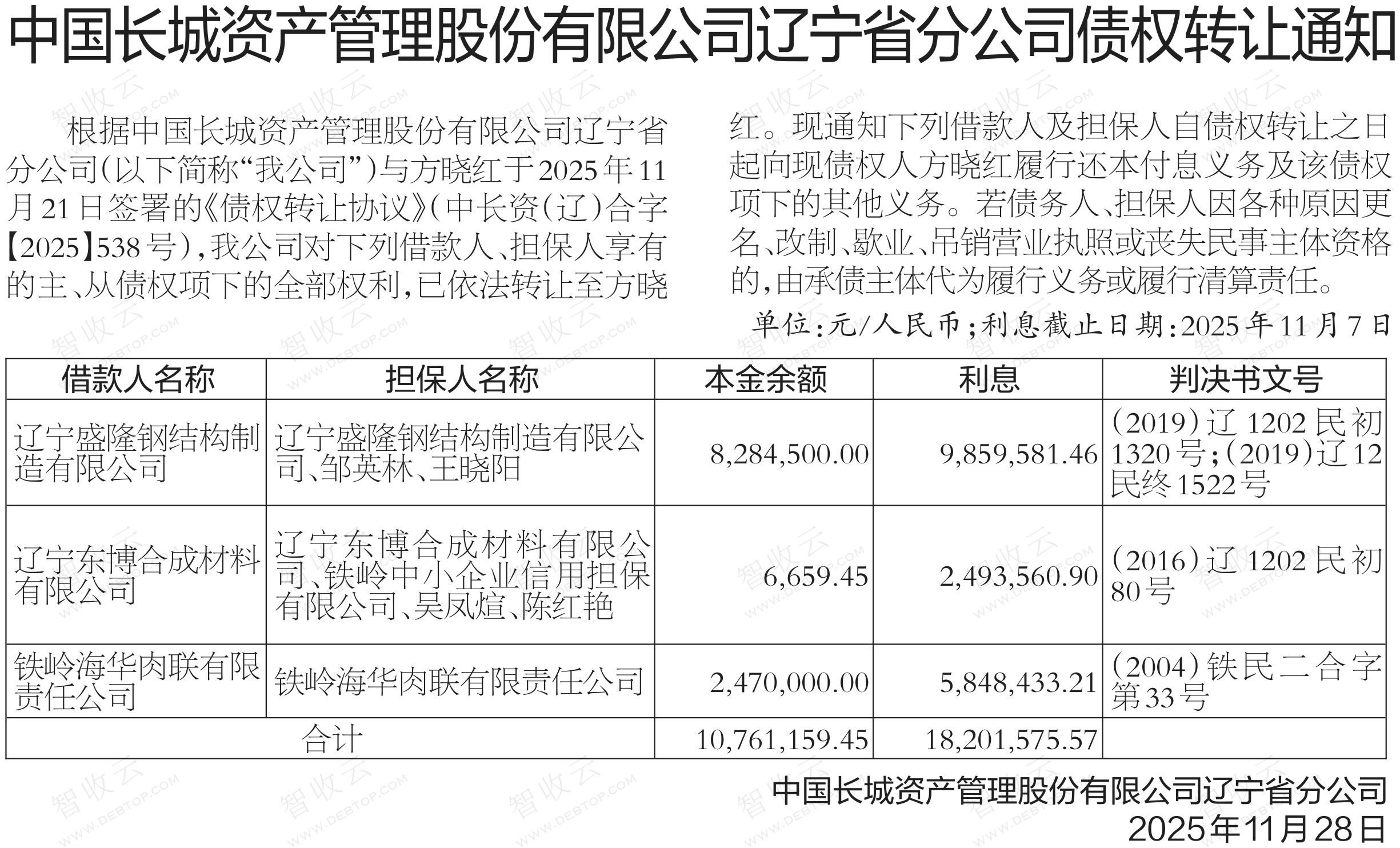 辽宁东博合成材料有限公司,铁岭海华肉联有限责任公司,中国长城资产管理股份有限公司辽宁省分公司债权转让通知,公告日期:2025-11-28,转让方:中国长城资产管理股份有限公司辽宁省分公司,受让方:方晓红,资产总额:2896.3万元。